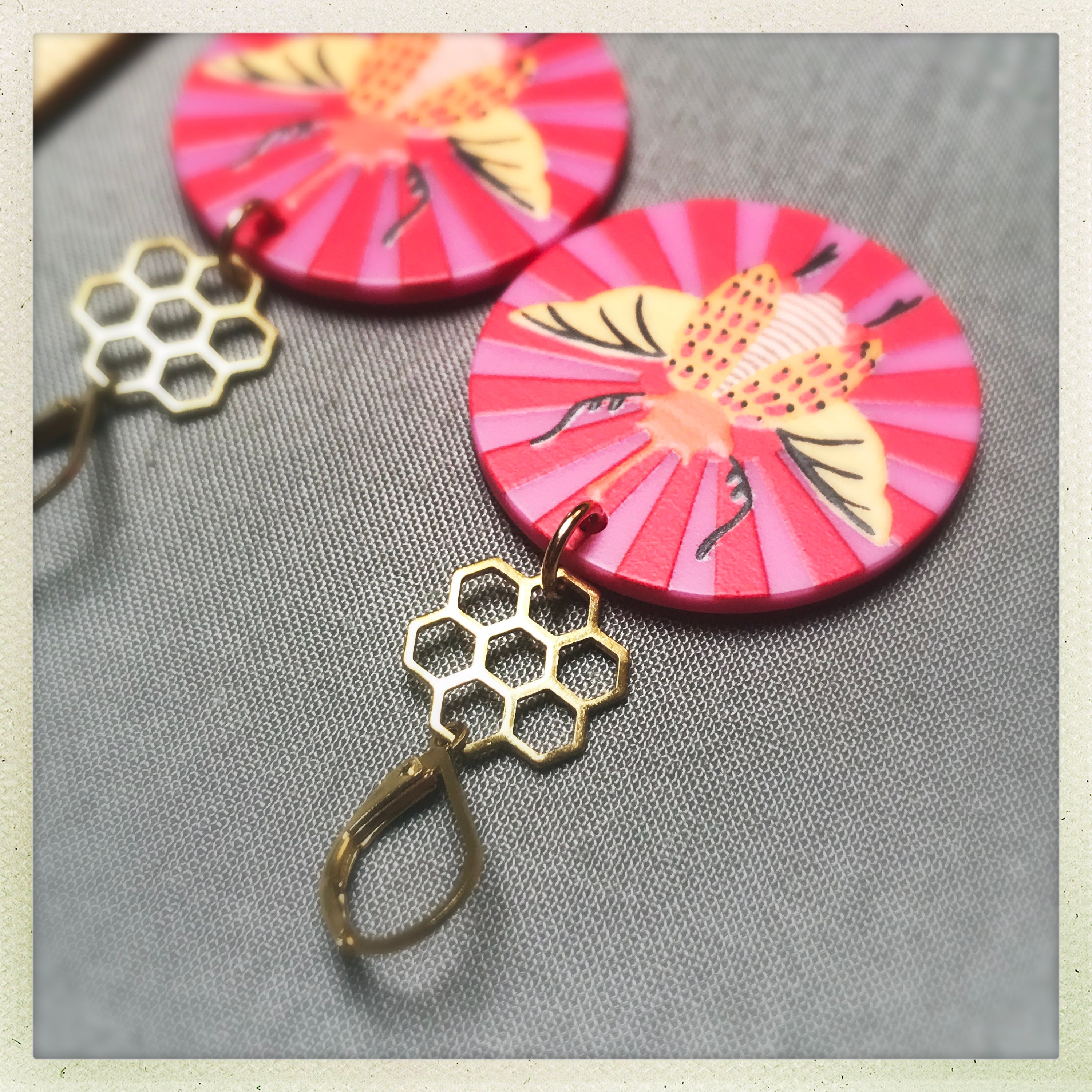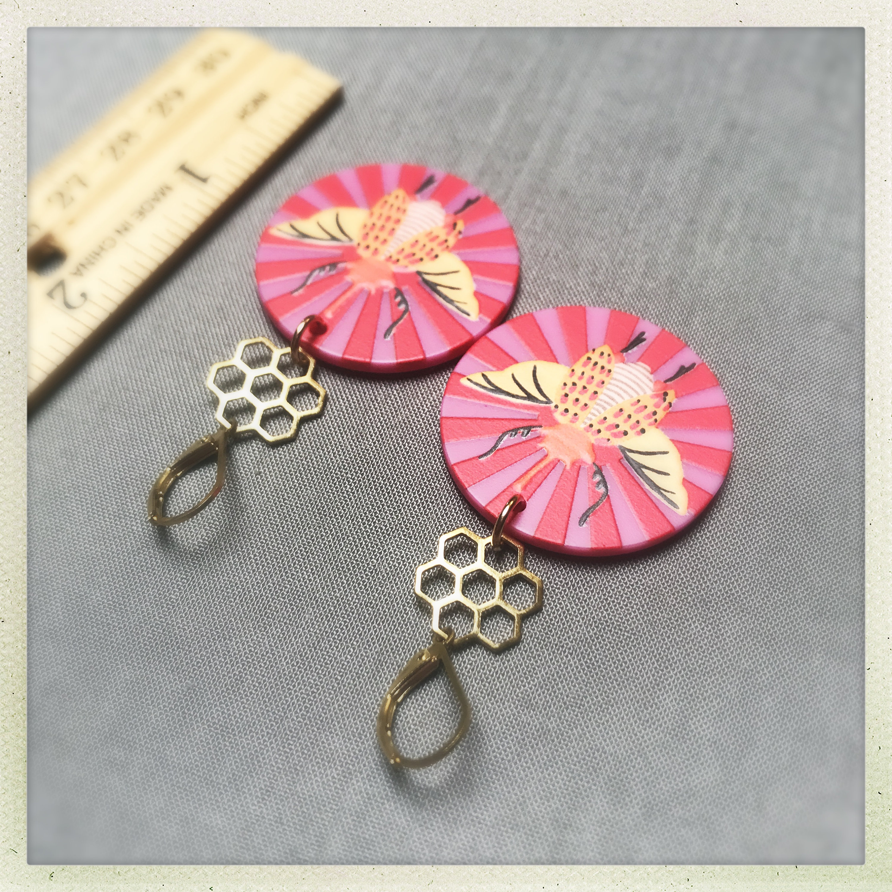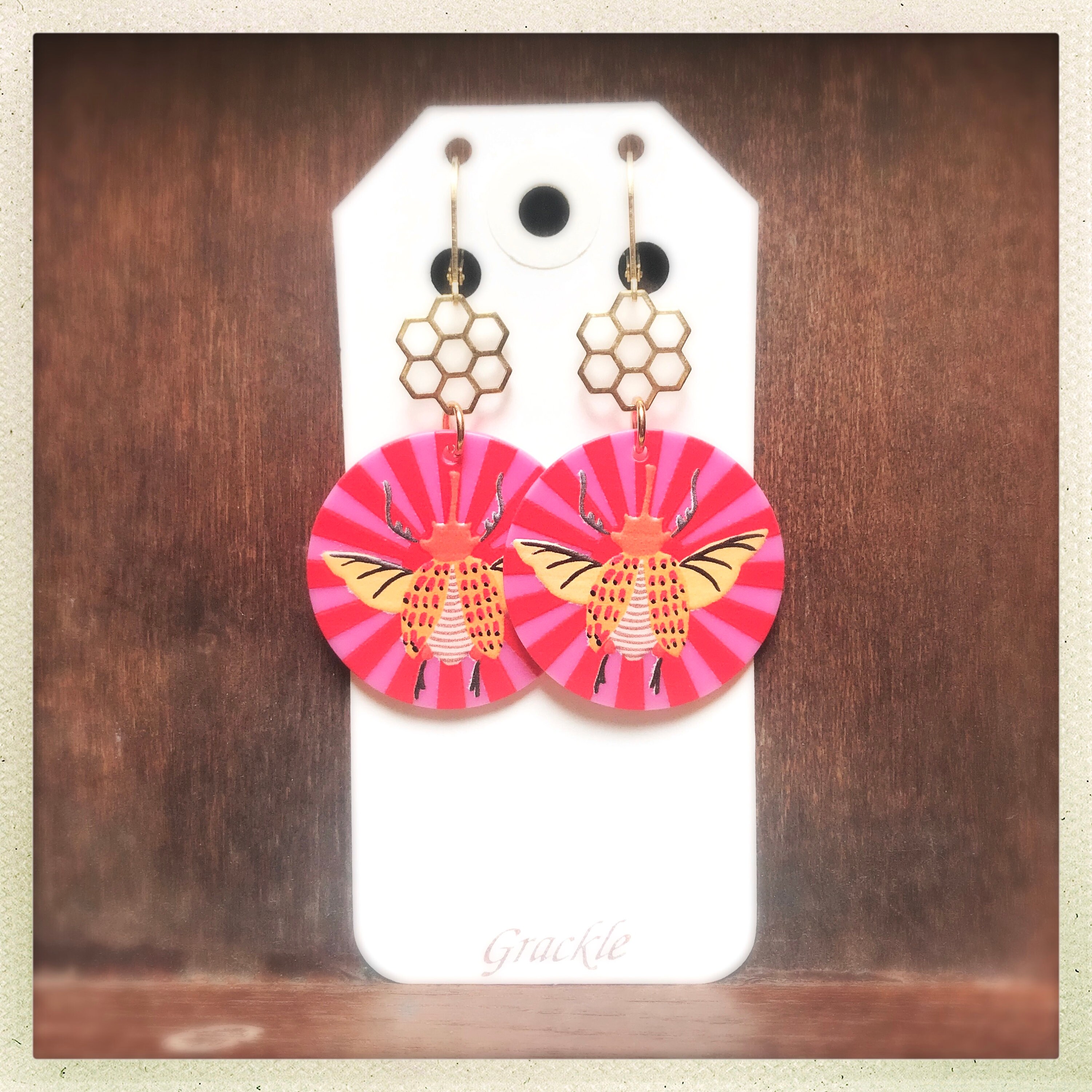 * Colorful acrylic charms with bright pink and red stripes and embossed insects