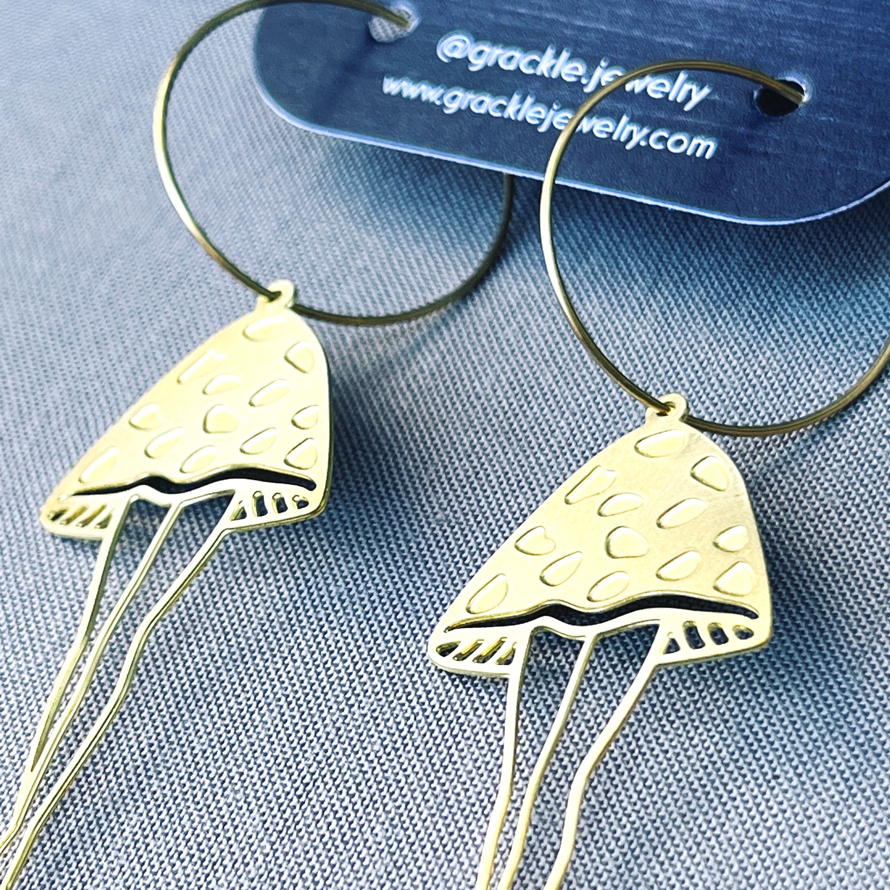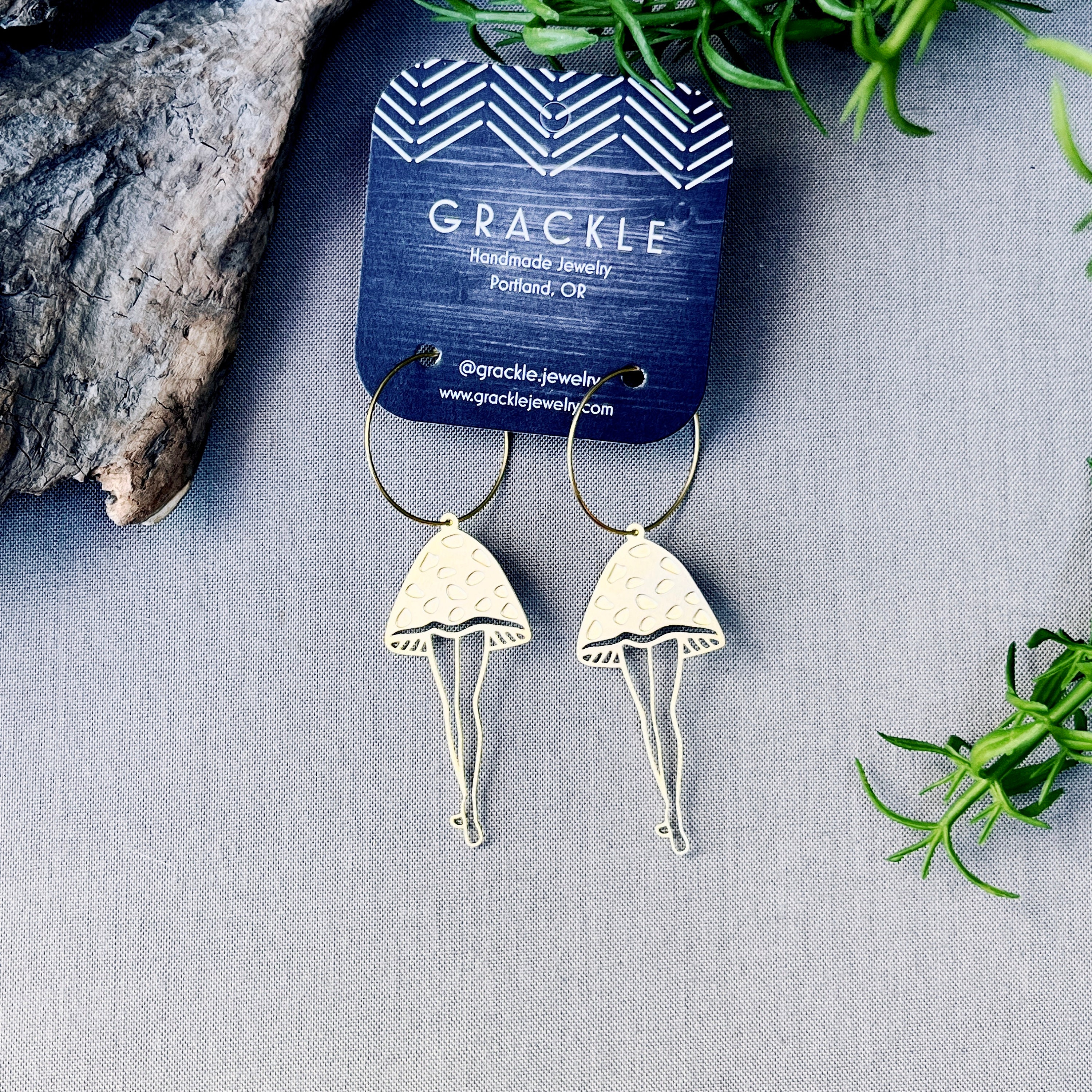 ⁍ Lightweight mushroom charms hang from delicate one-inch brass hoops