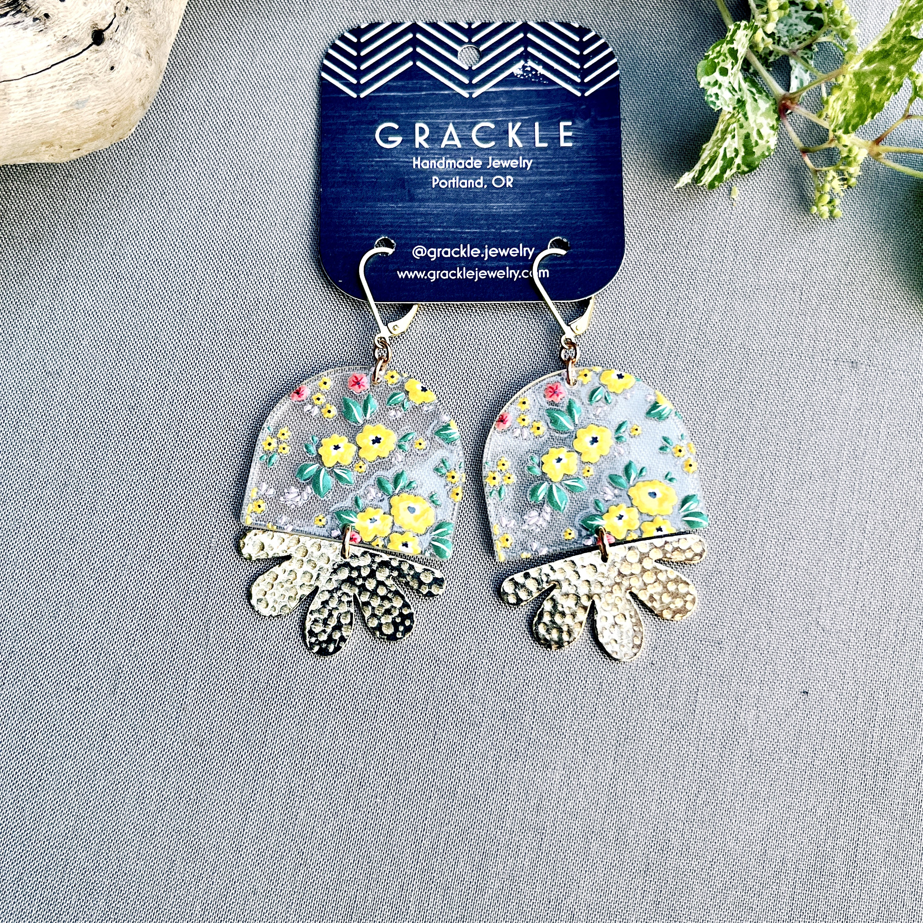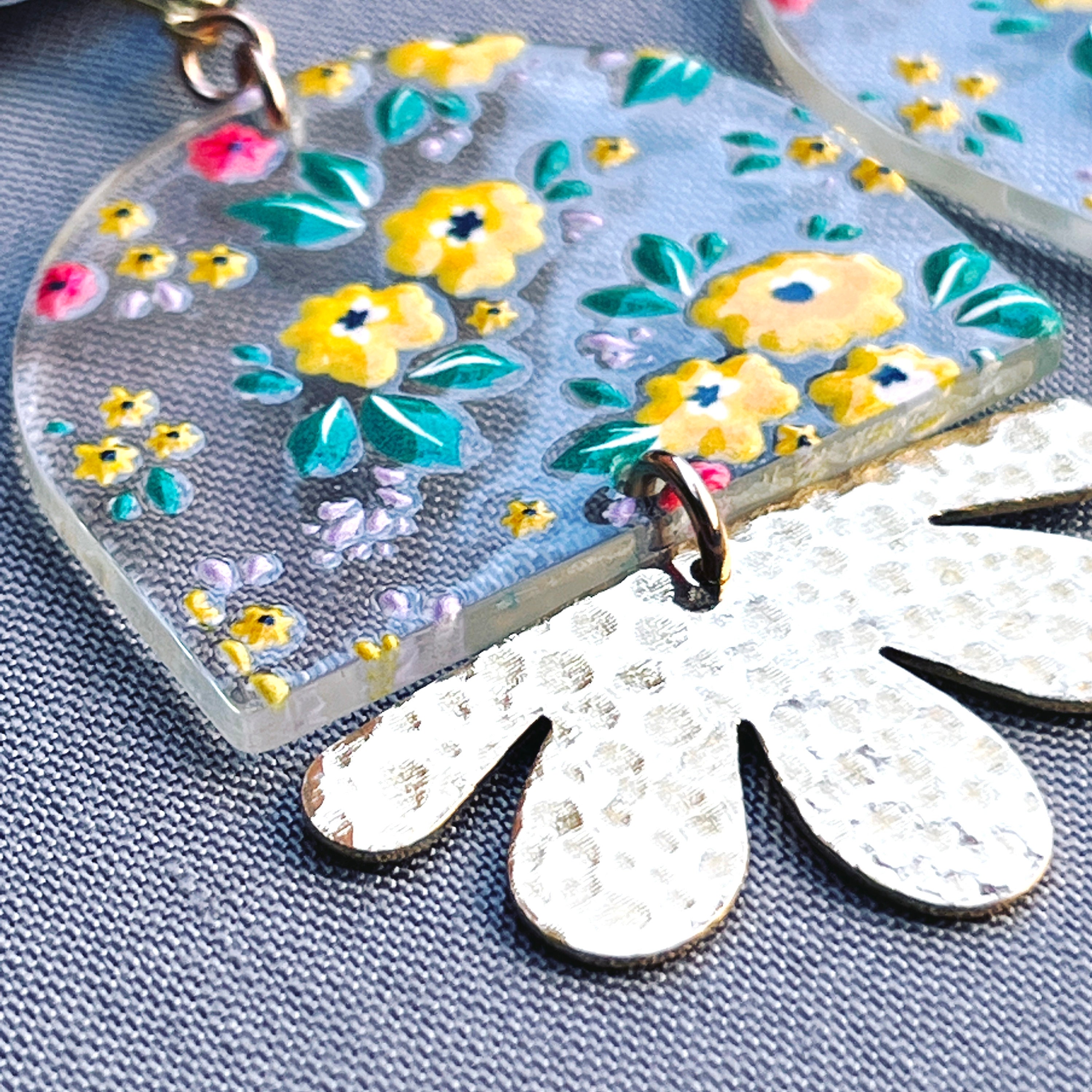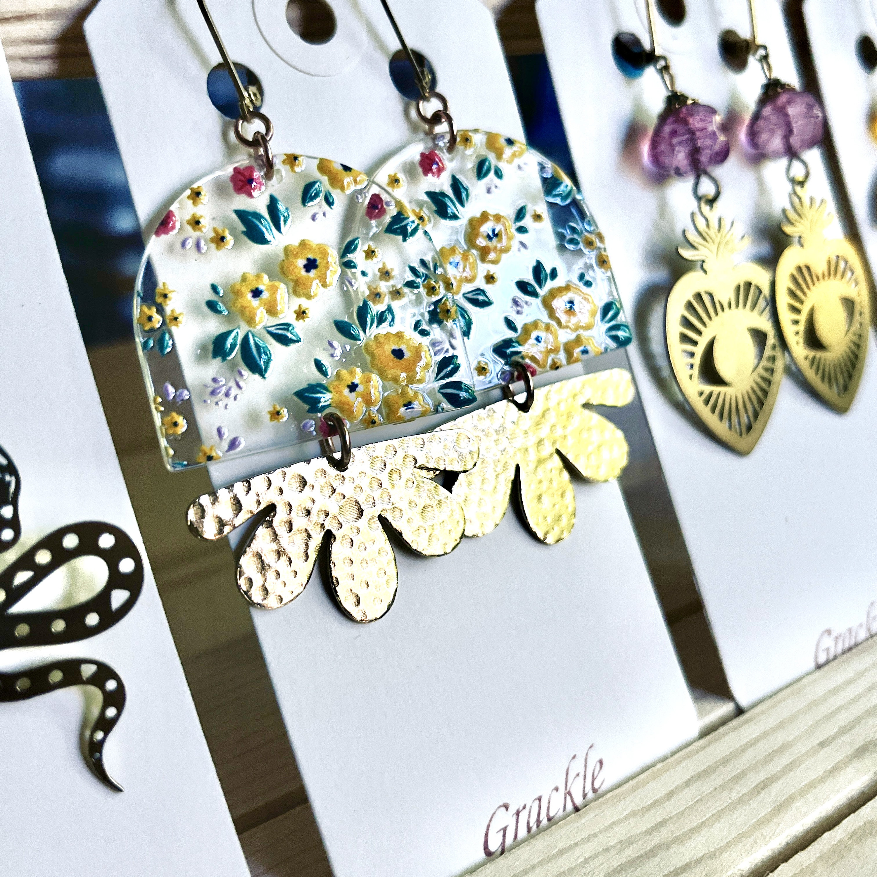 • Lightweight acrylic arches embossed with yellow and pink flowers and paired with brass petal charms