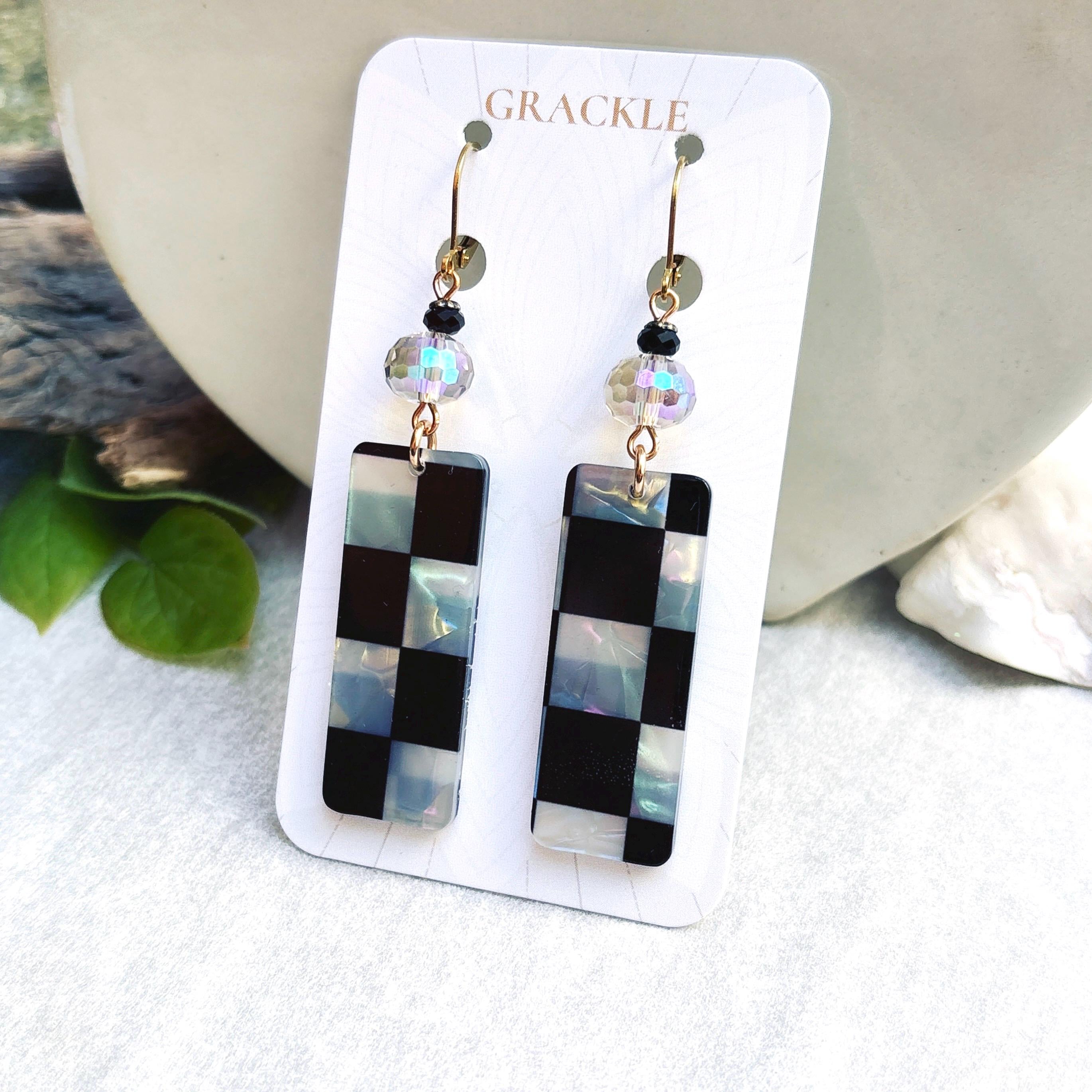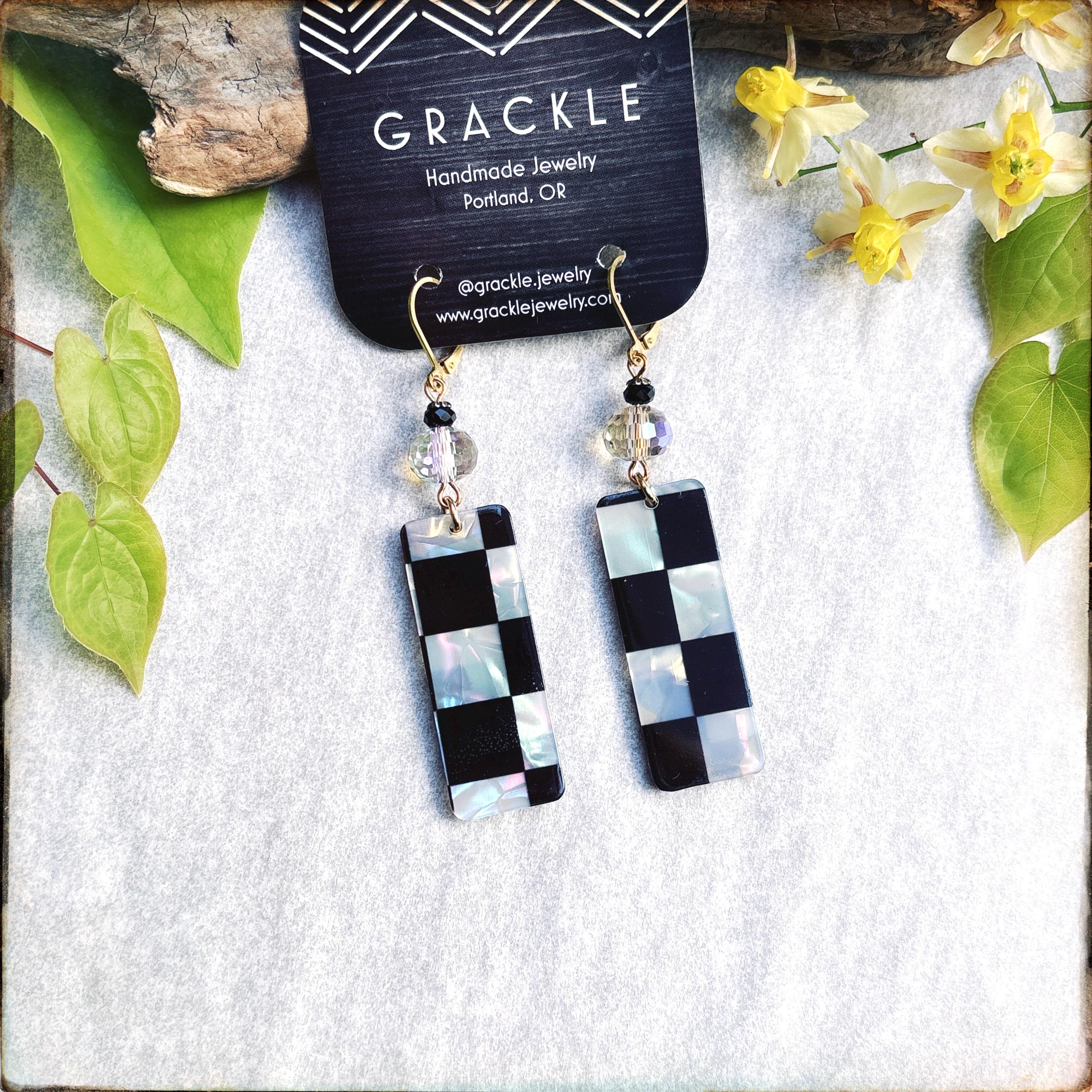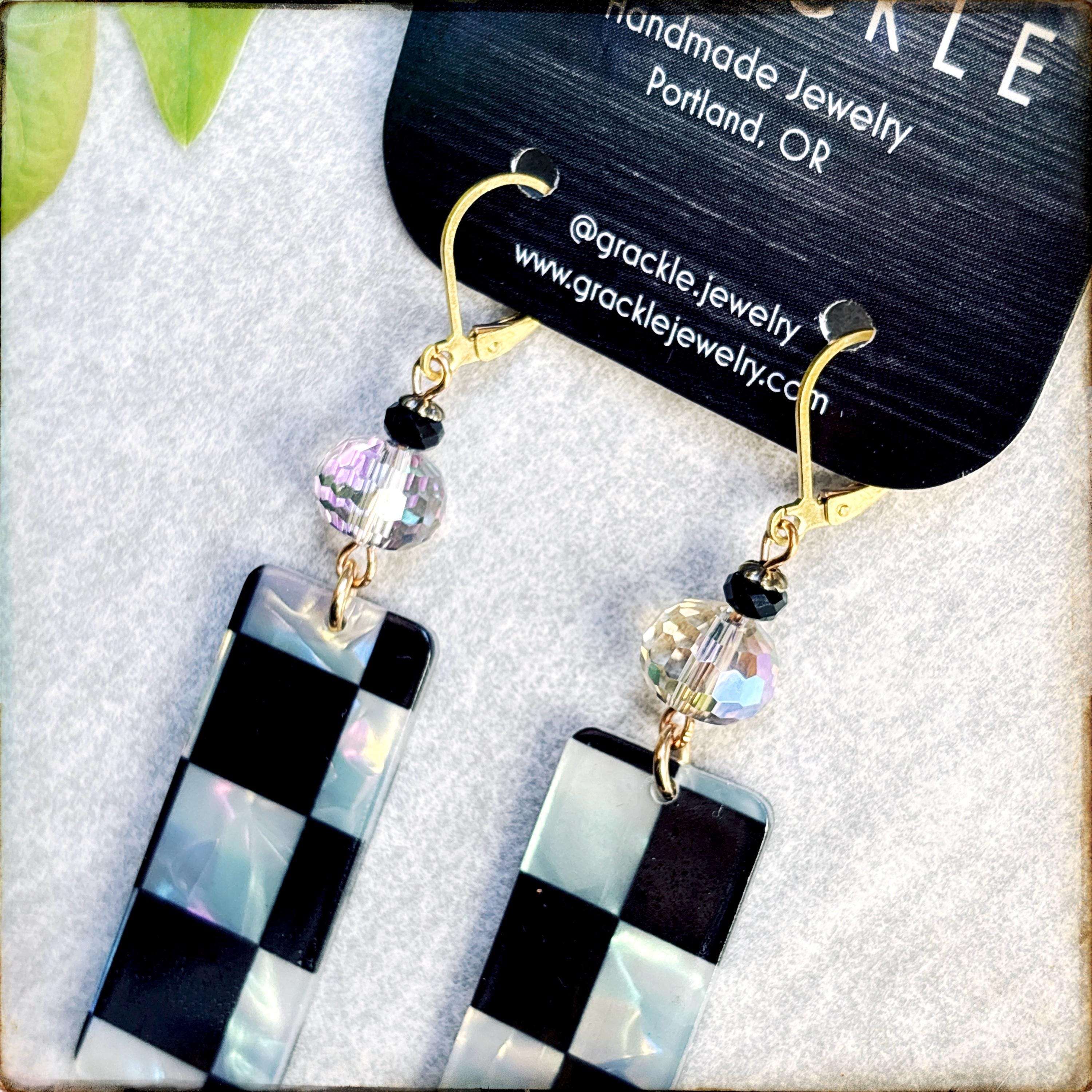 • Pearly black and white acetate with iridescent glass beads and brass findings
