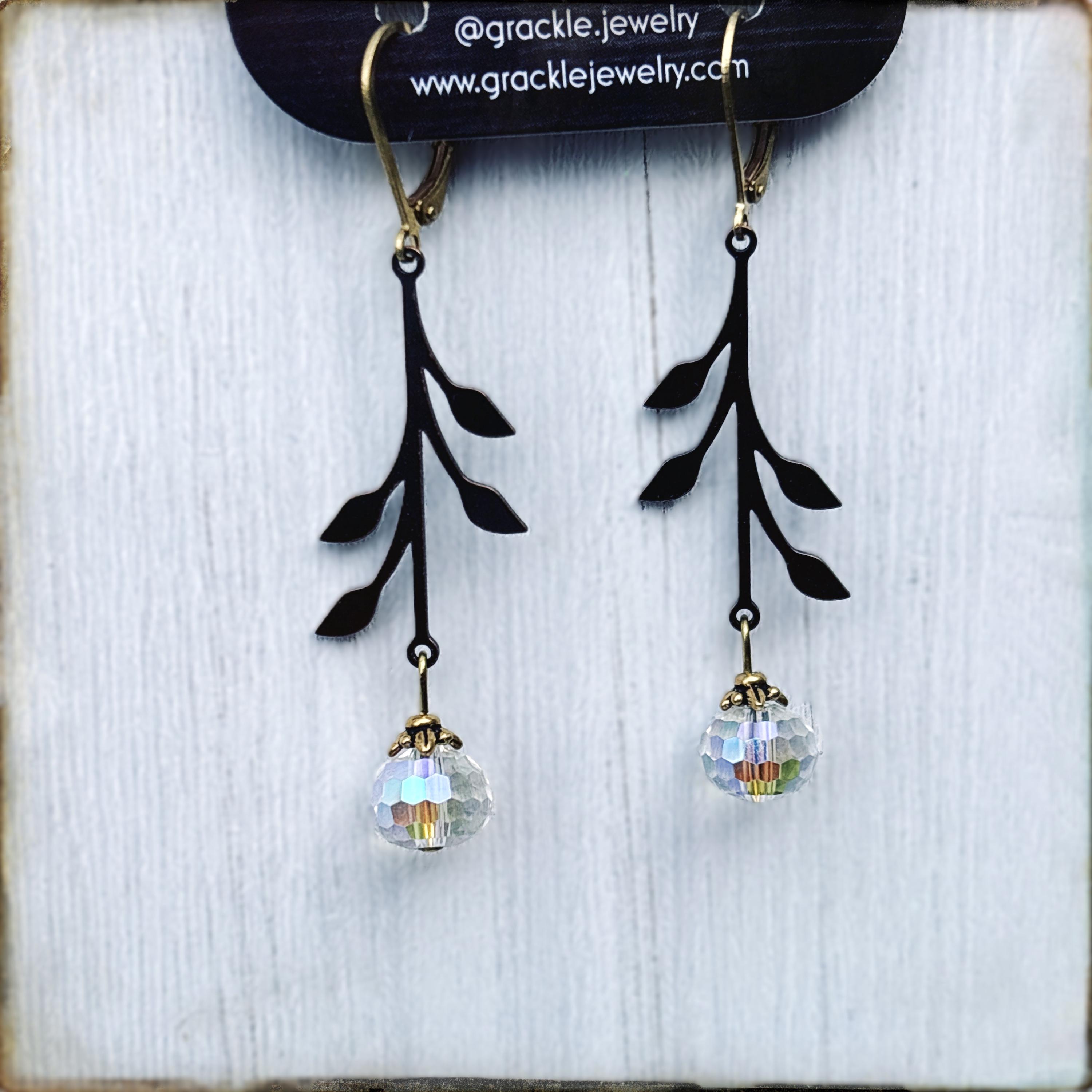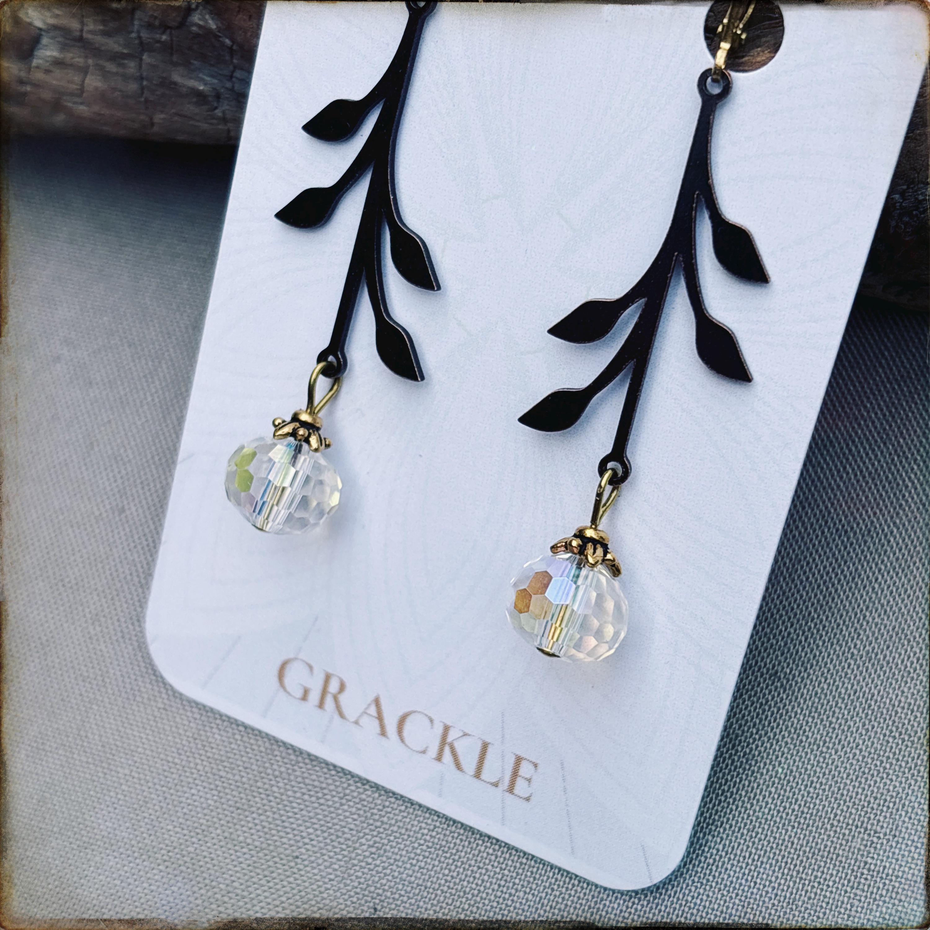 • Delicate branch charms made of black oxidized brass hold multi faceted iridescent glass beads