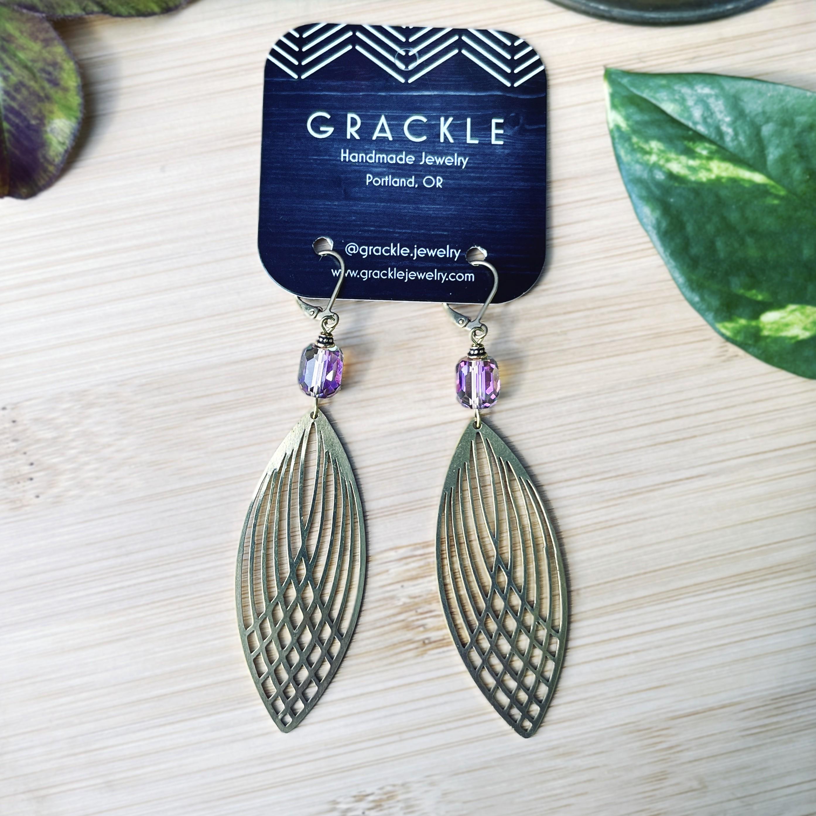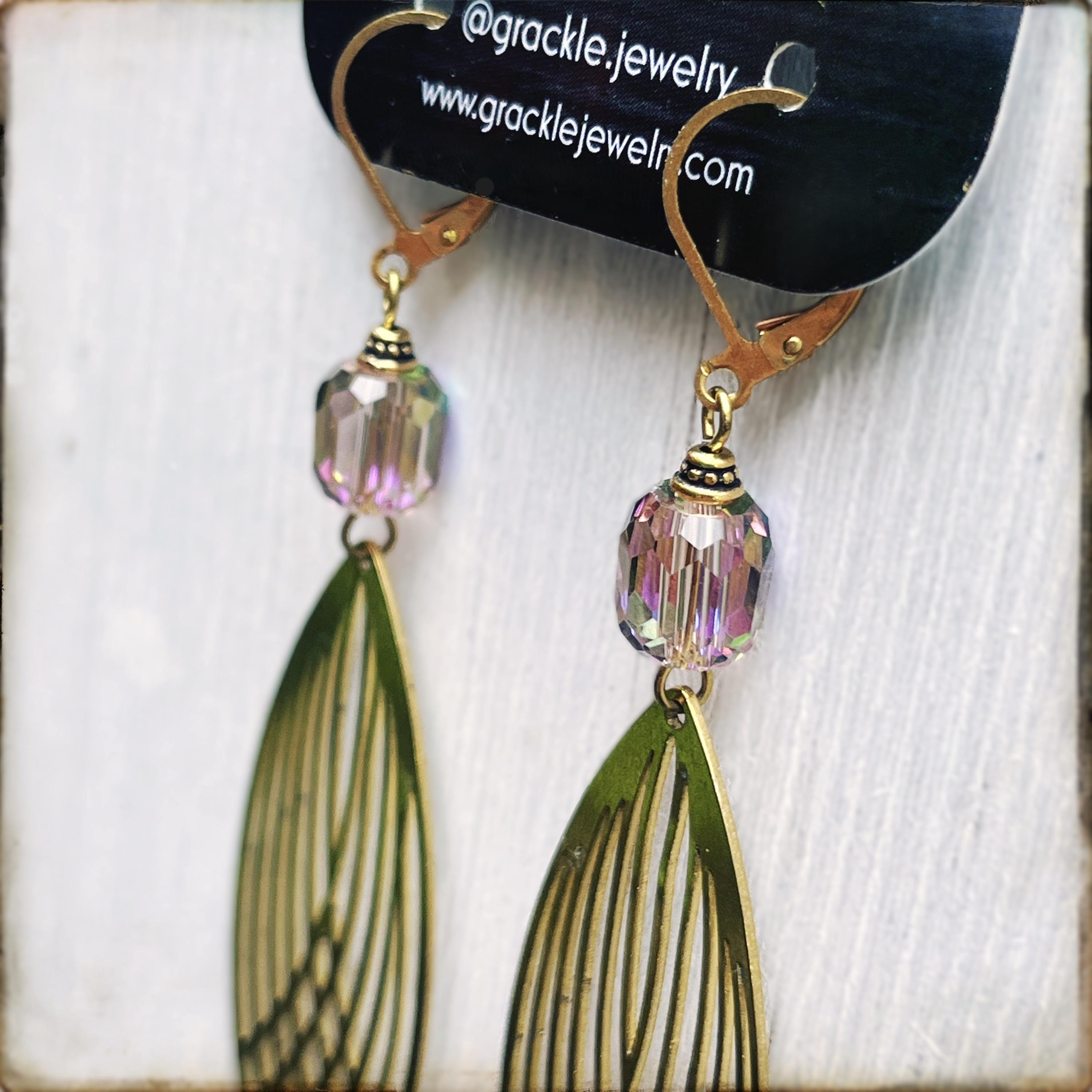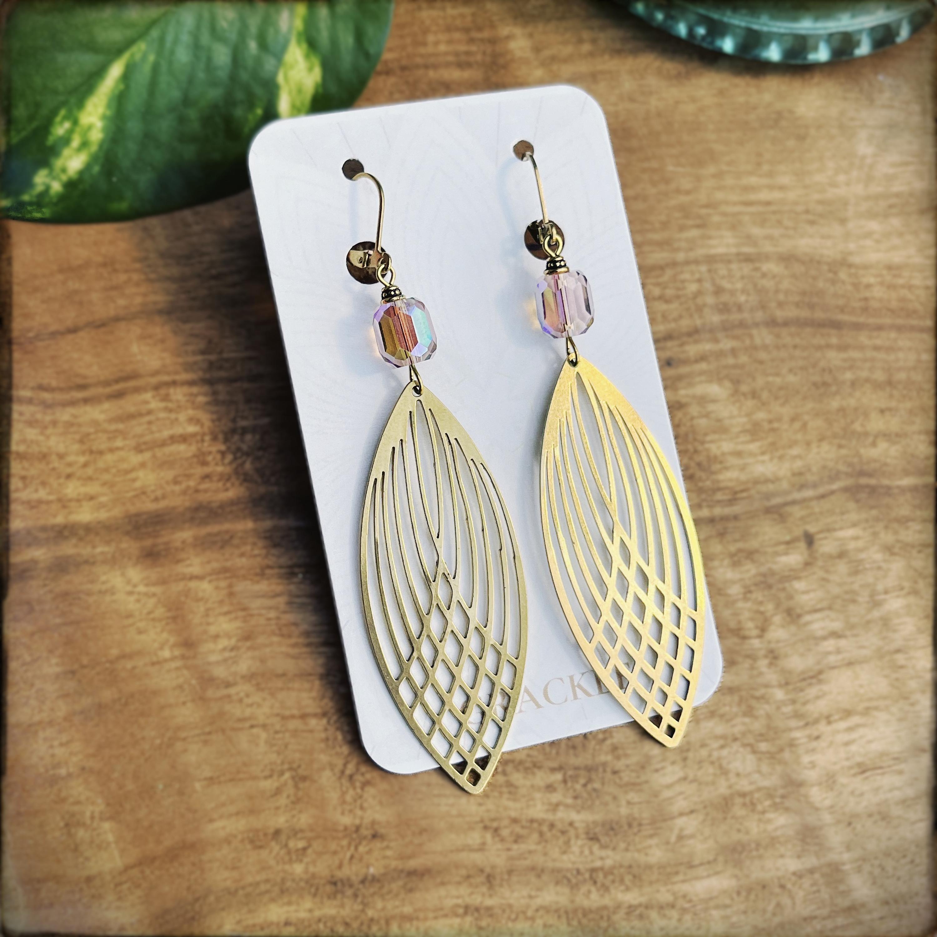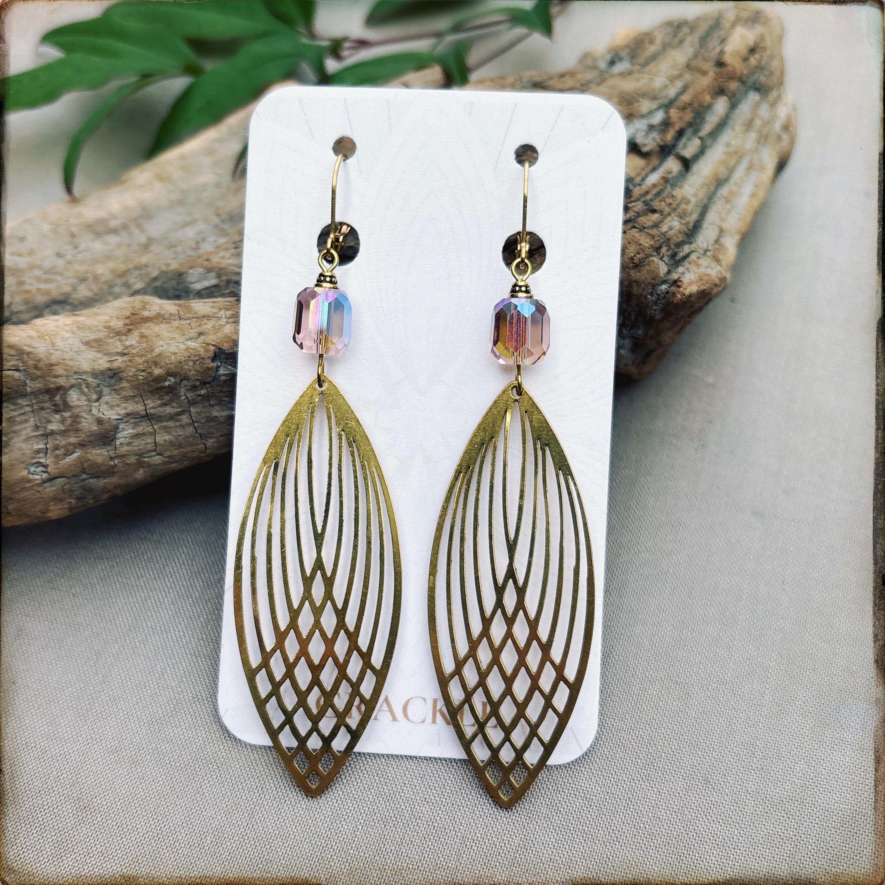 • Geometric marquis shaped brass pendants with faceted pale rose glass beads