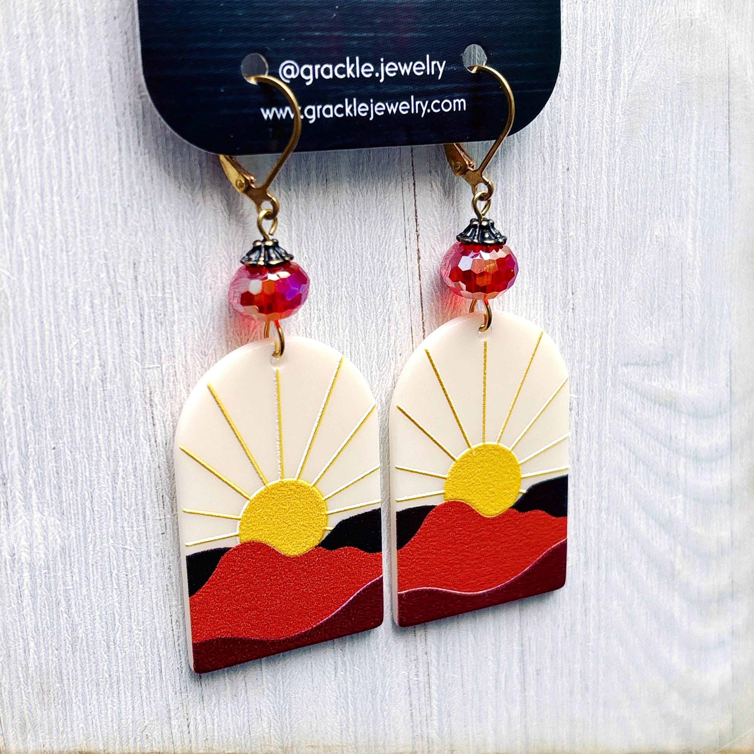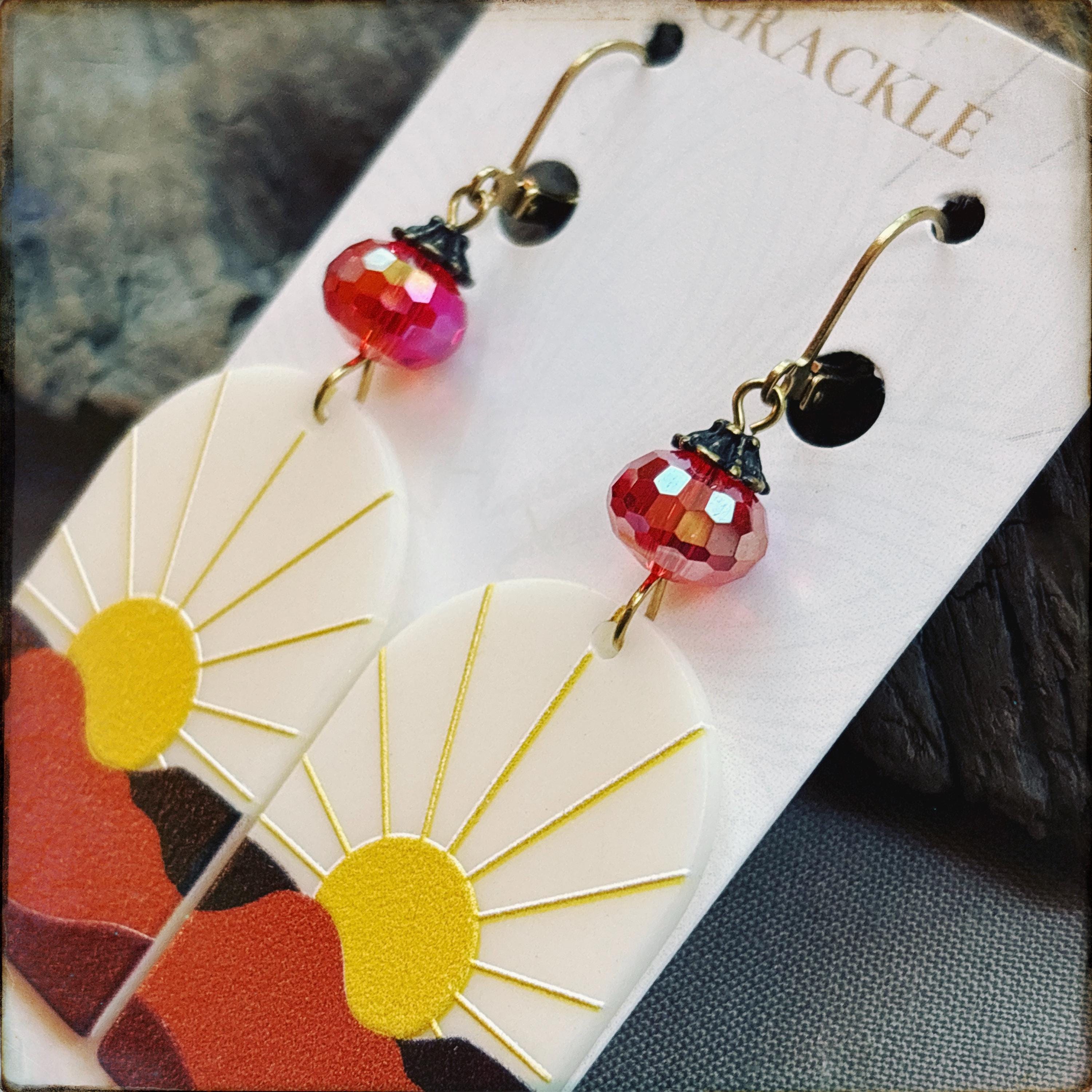 • Lightweight resin charms with embossed sunrise scenes and iridescent red glass beads