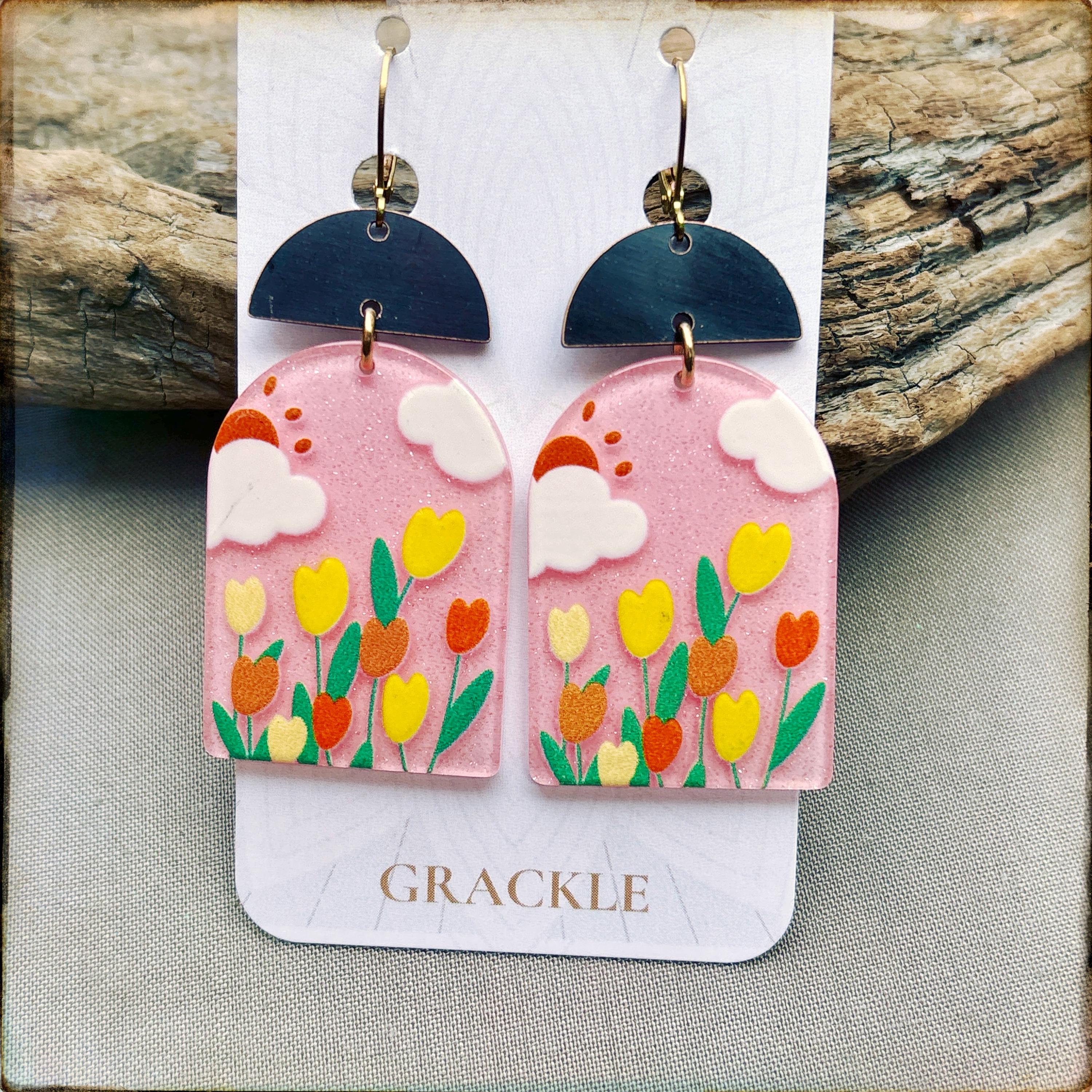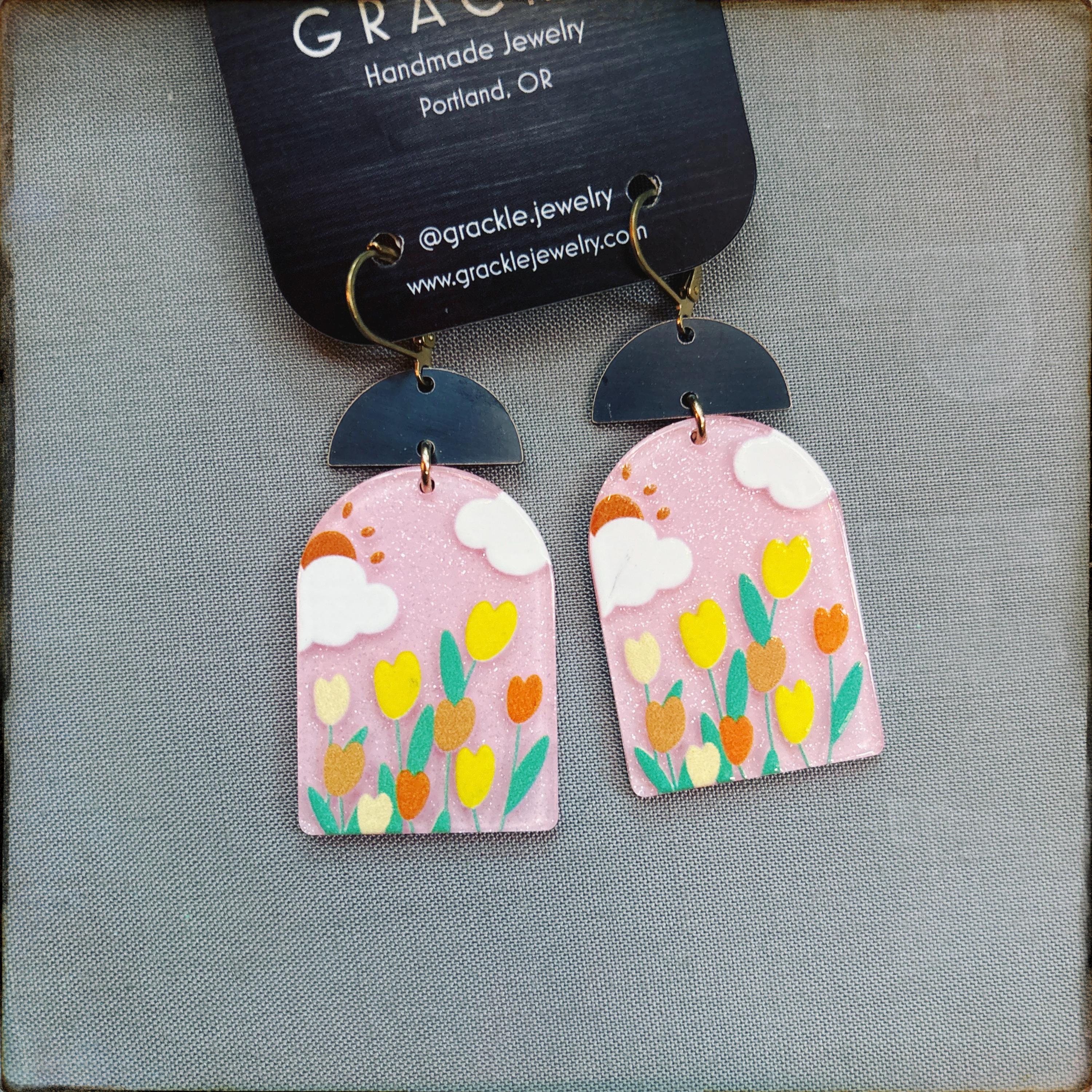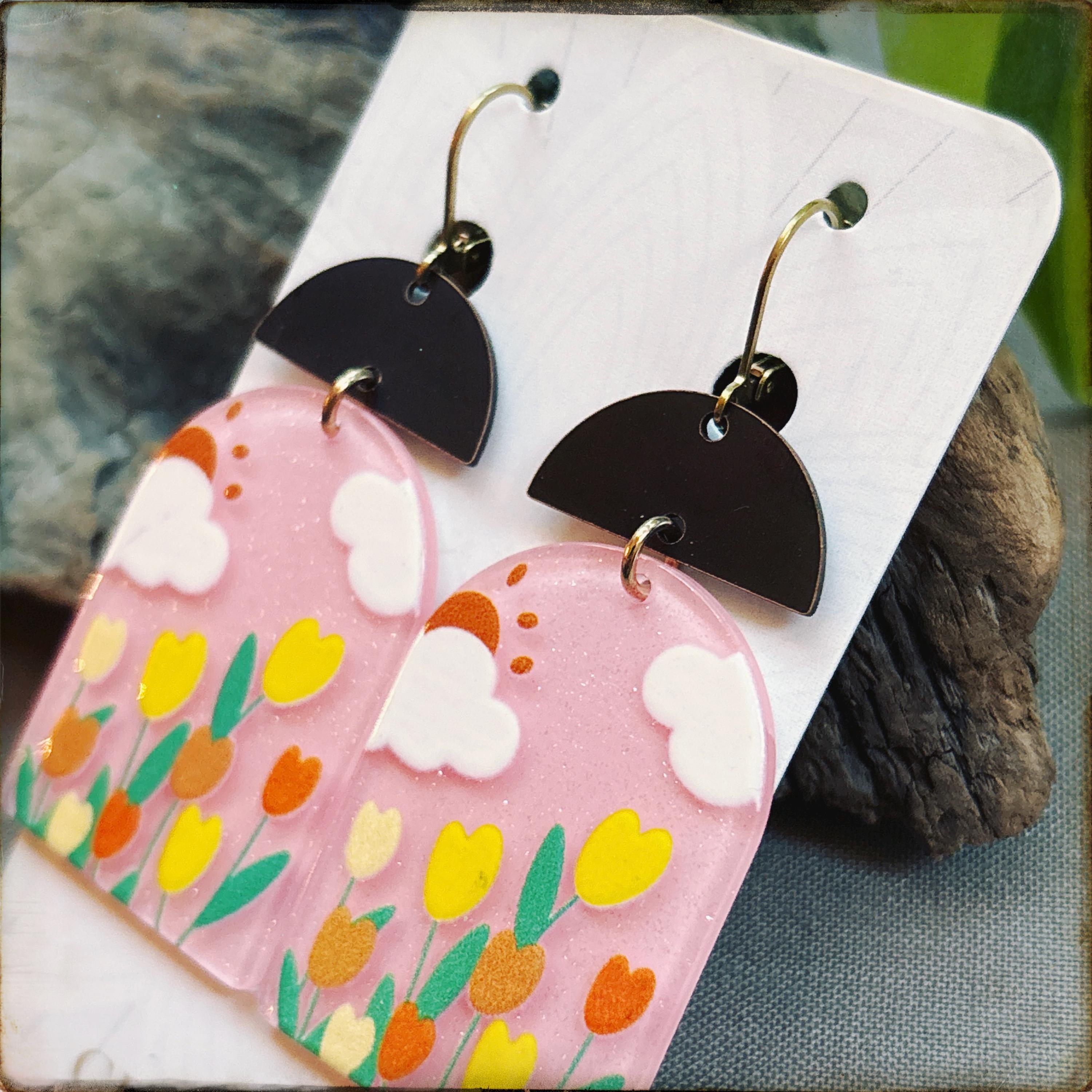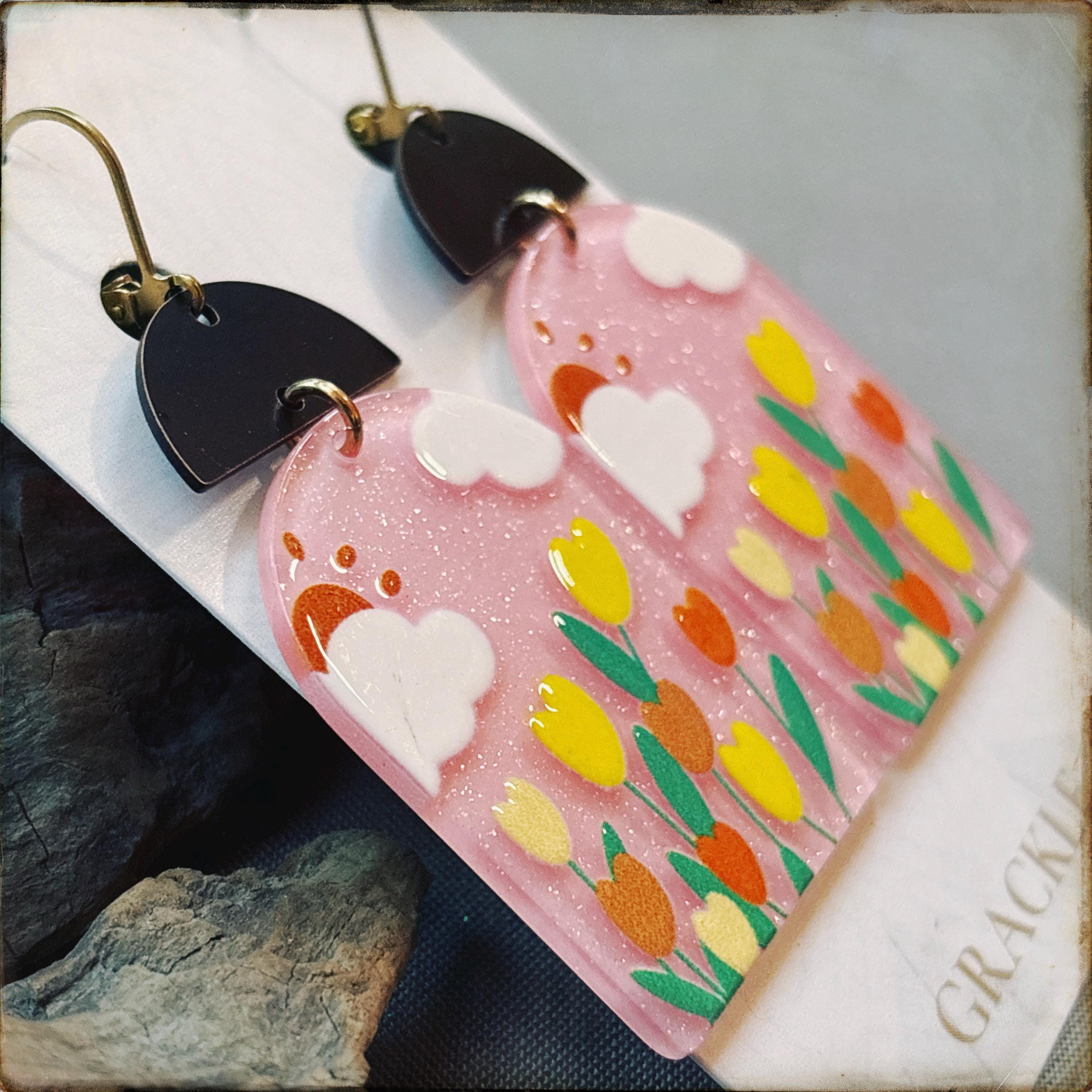 • Shimmery pink resin charms embossed with tulips and clouds hang from oxidized black brass semi circles