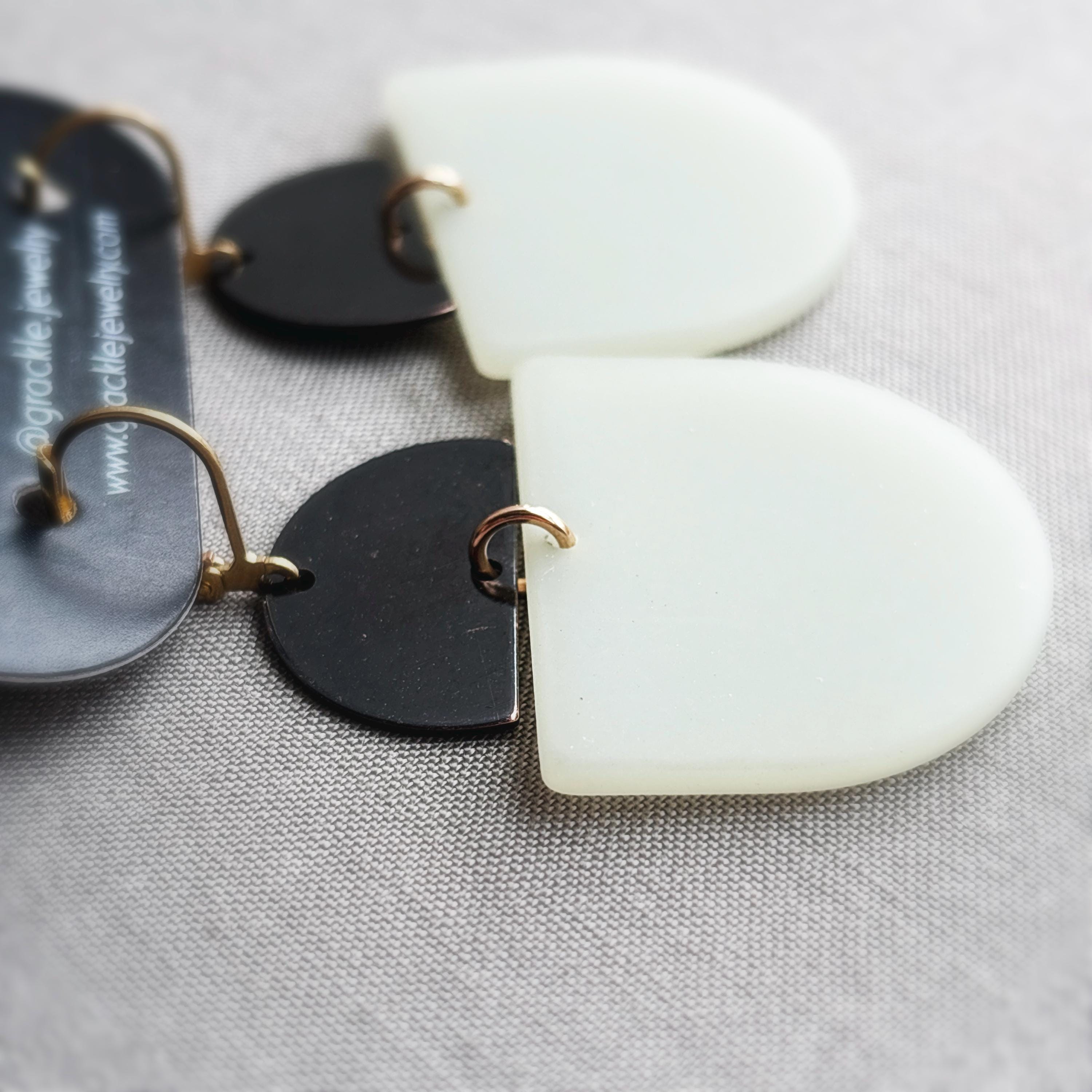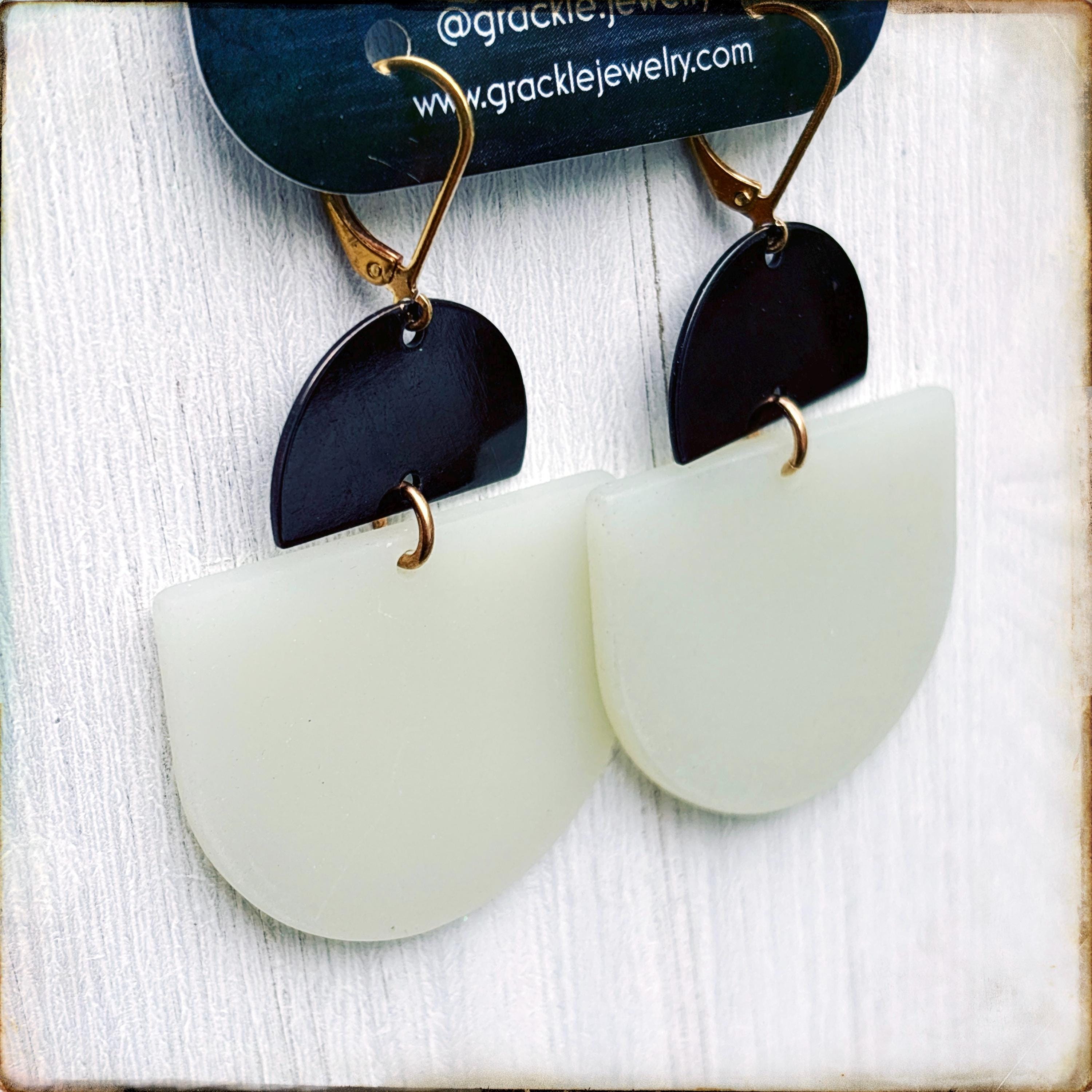 • Black oxidized brass and opaque matte pale sage resin pendants