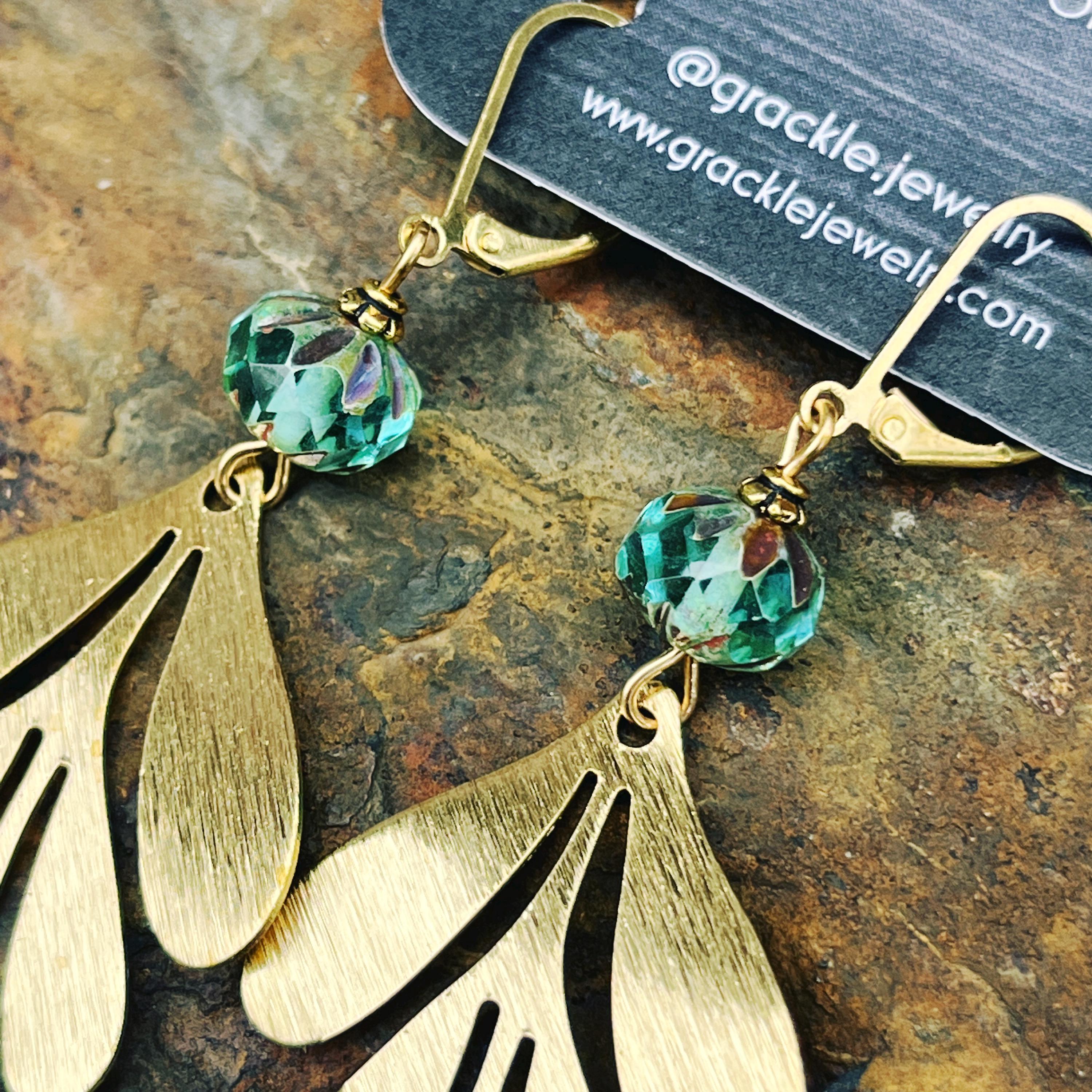 • High quality fire-polished Czech glass beads paired with textured raw brass leaf charms