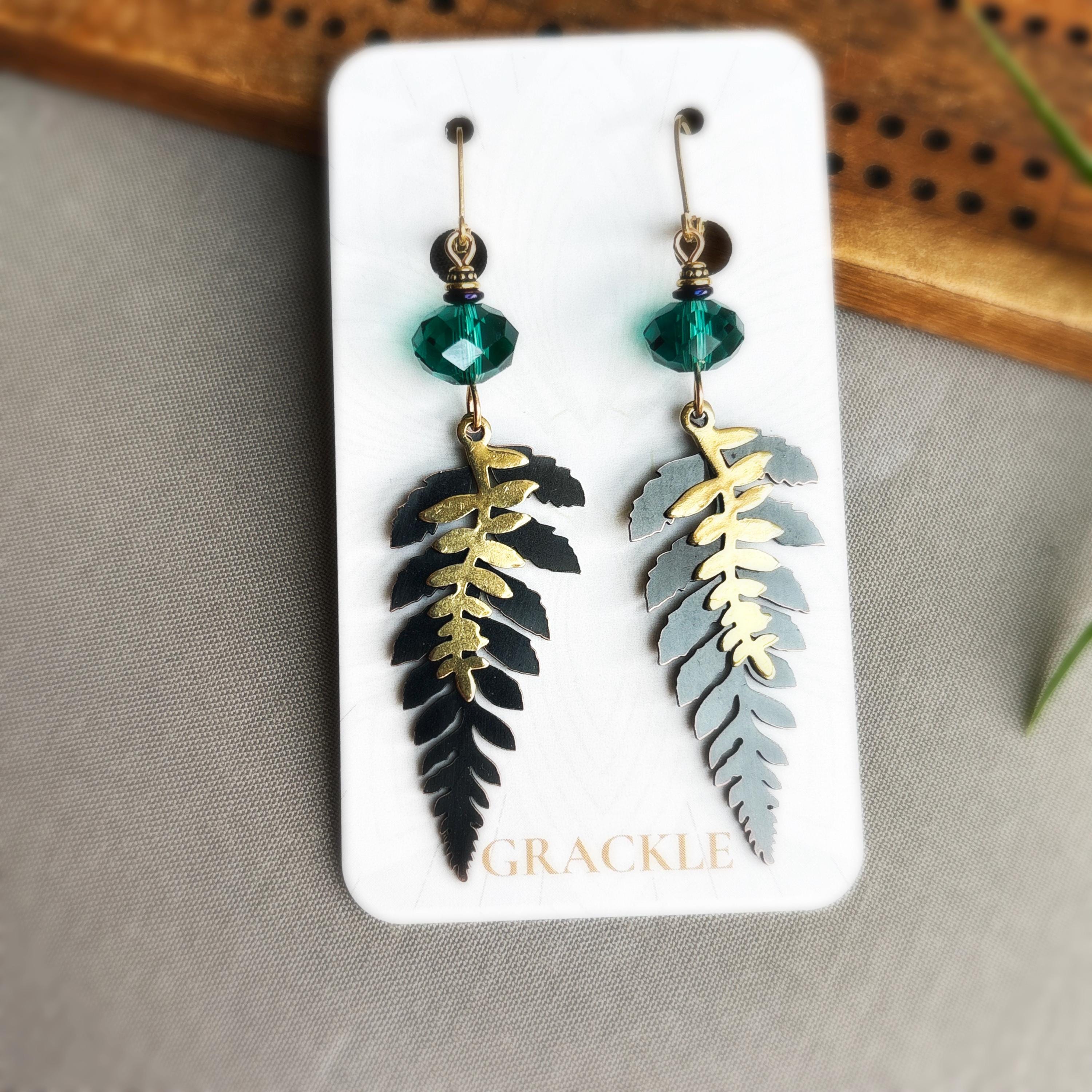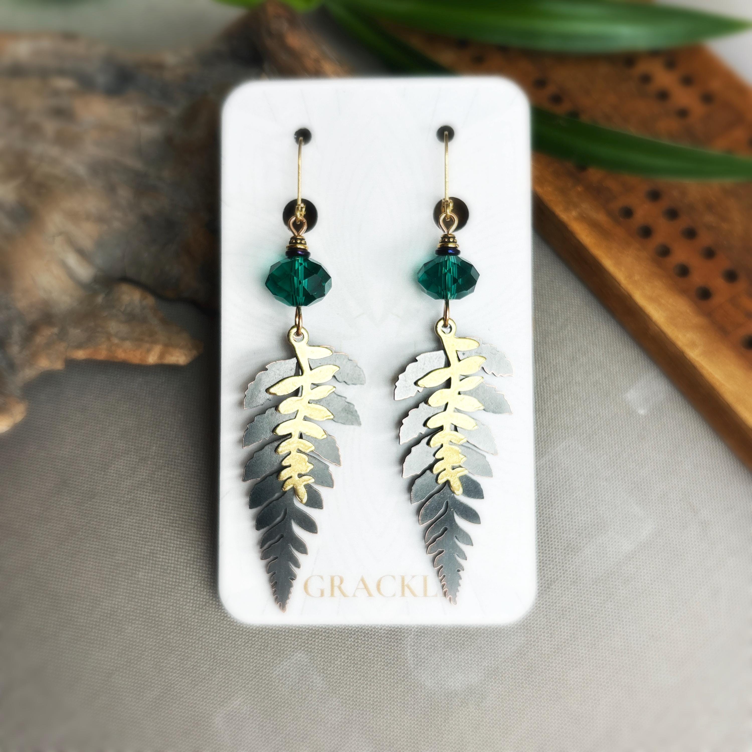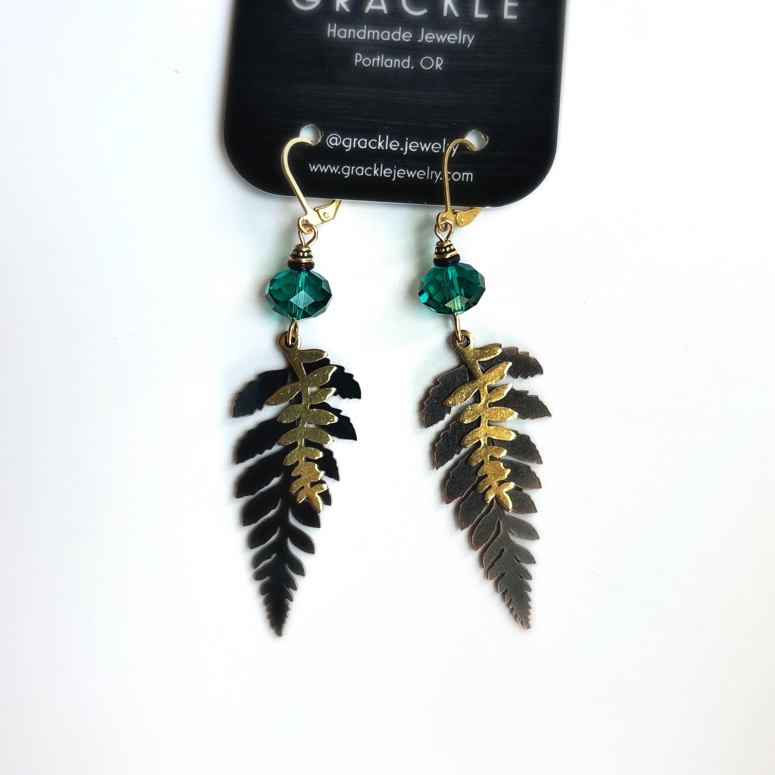 • Double brass leaf charms with deep blue emerald glass beads and brass accents