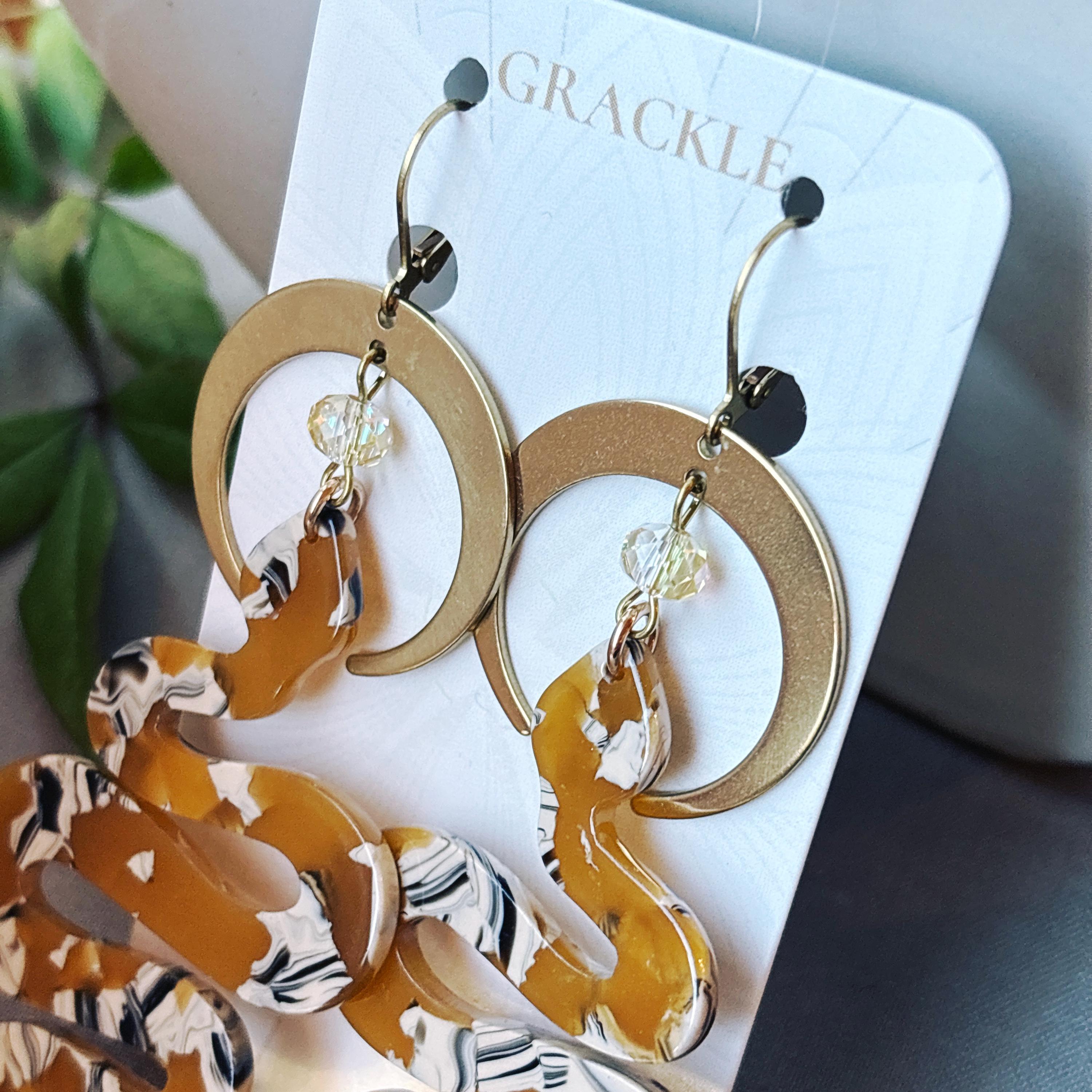 • Dijon-colored snake charms made of lightweight non-petroleum cellulose acetate, with glass beads and brass crescents
