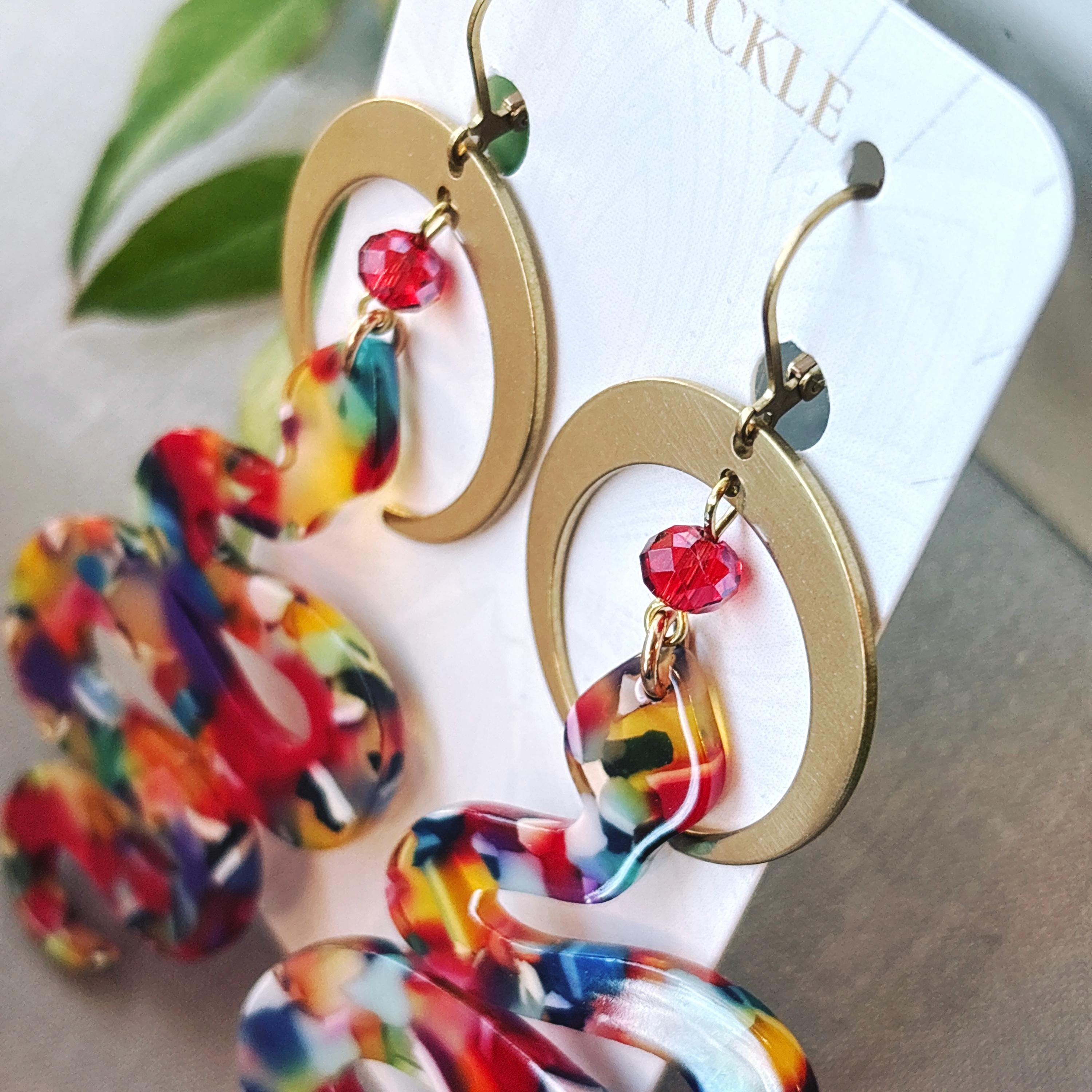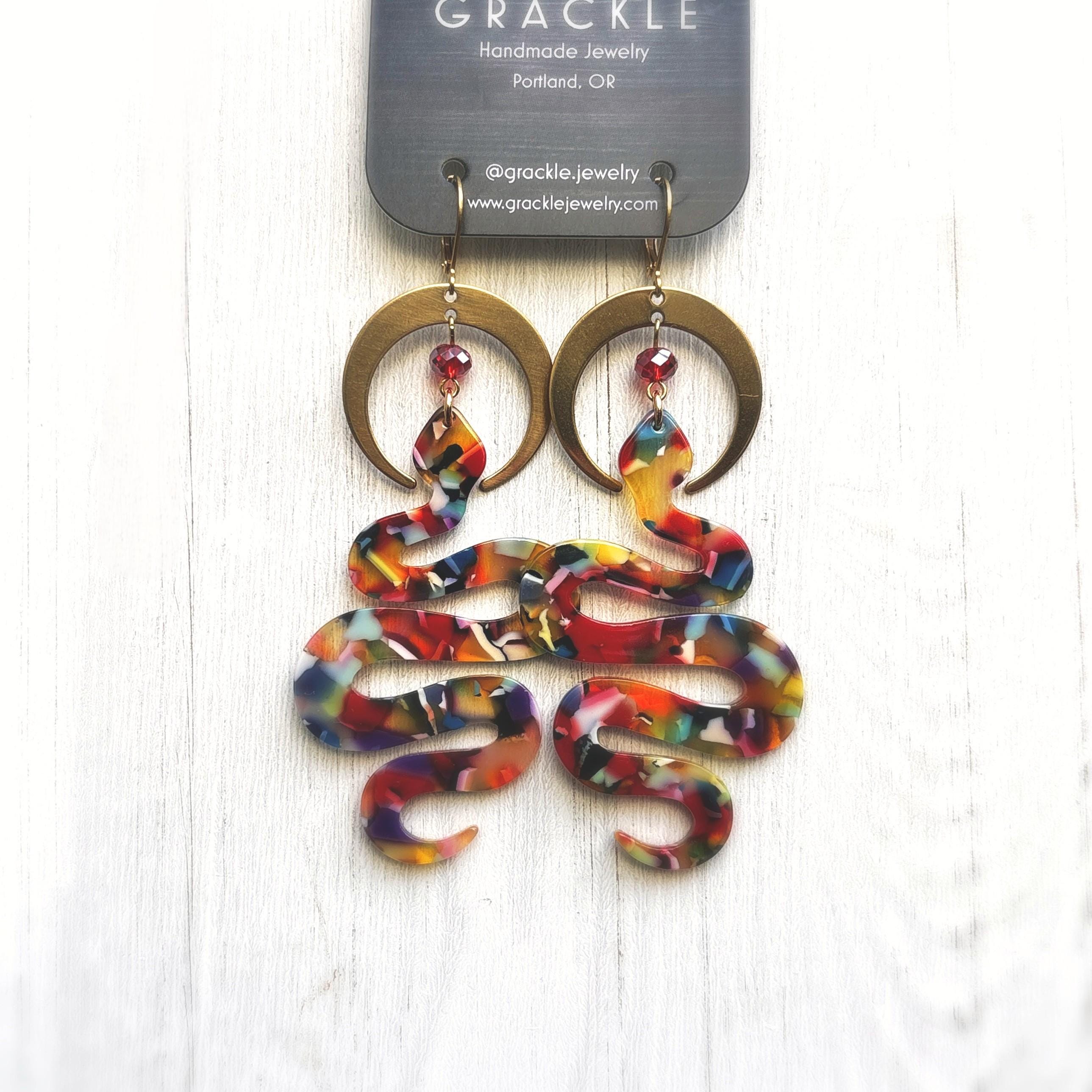 • Multip-colored snake charms made of lightweight non-petroleum cellulose acetate, with glass beads and brass crescent charms