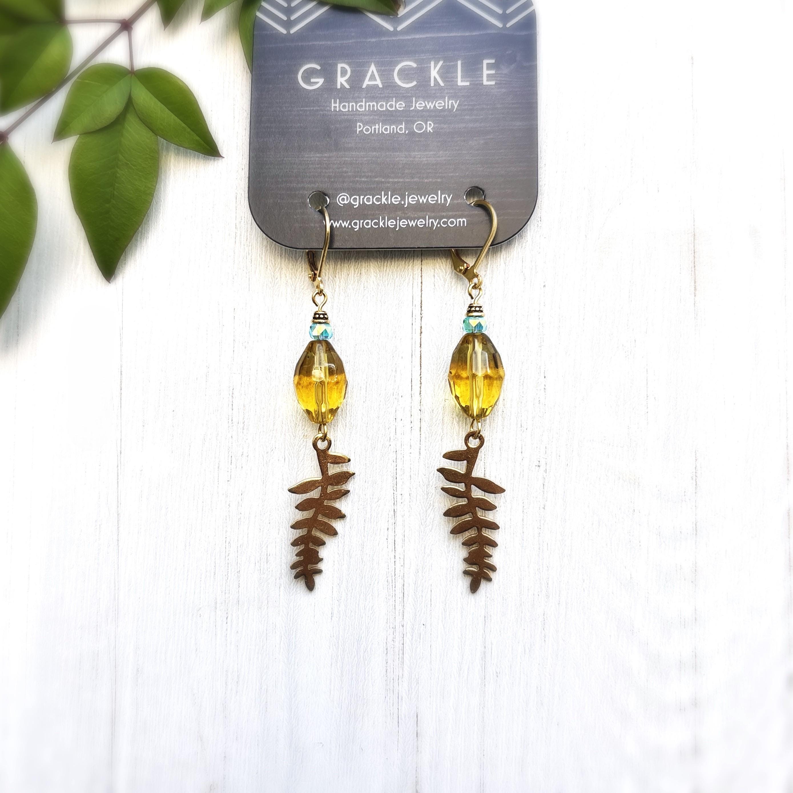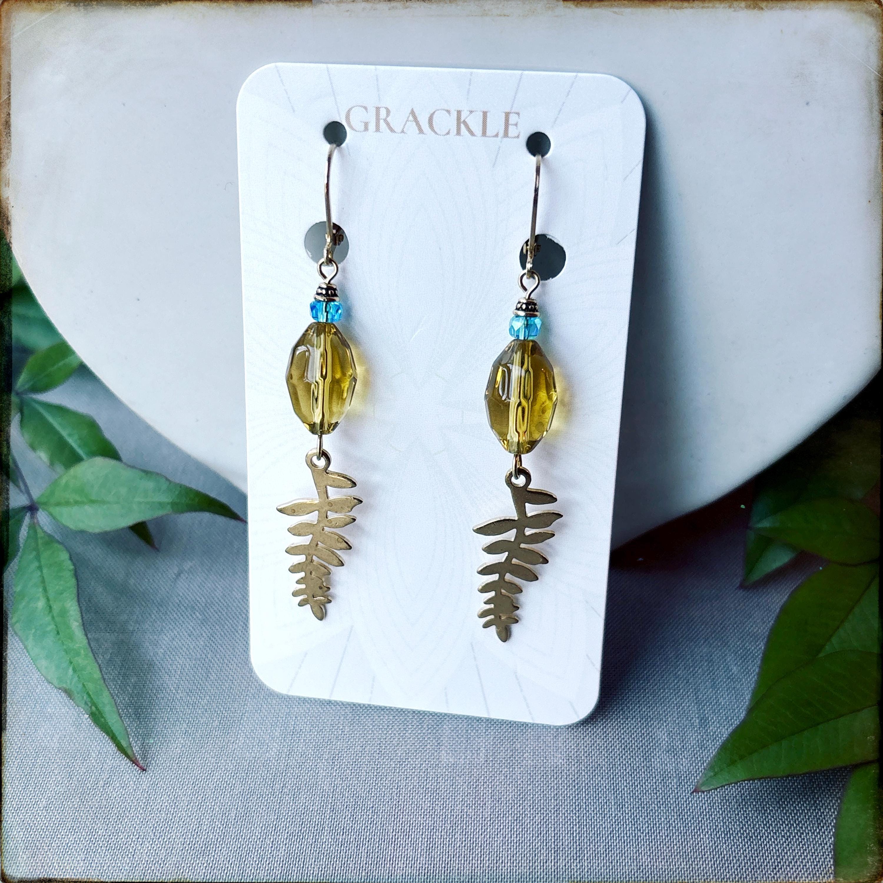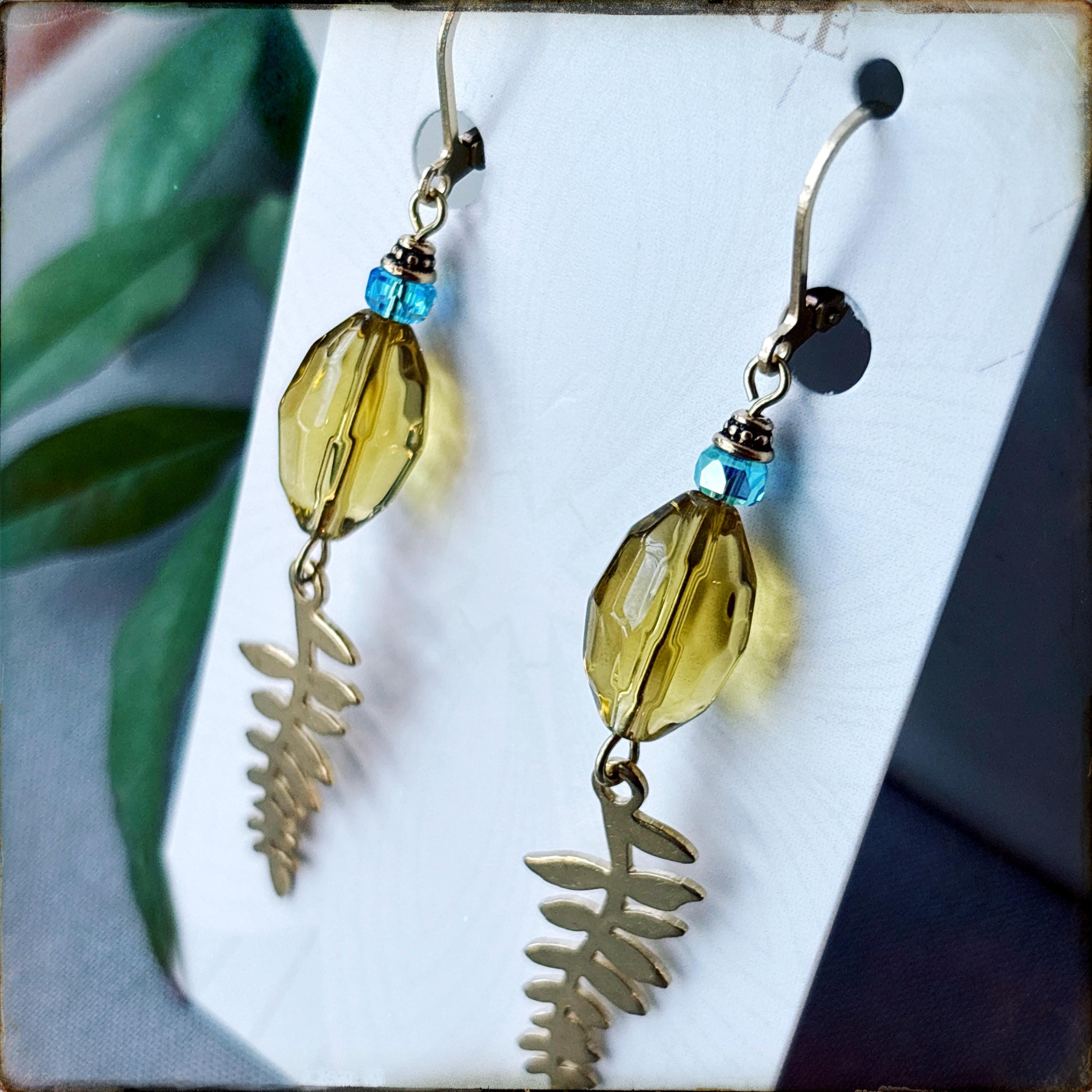 • Brass leaf charms with vintage olive glass beads with Mediterranean blue accents