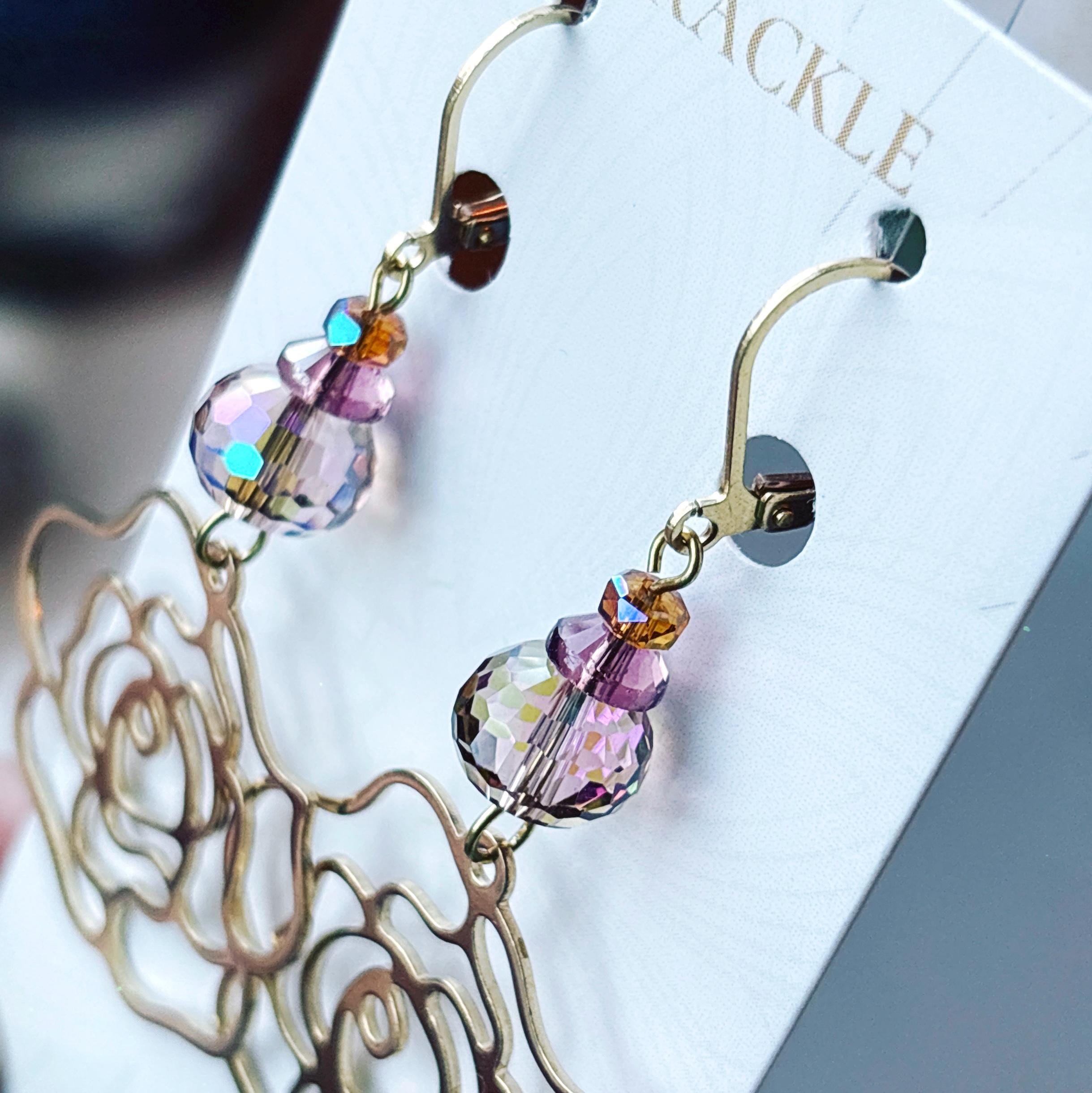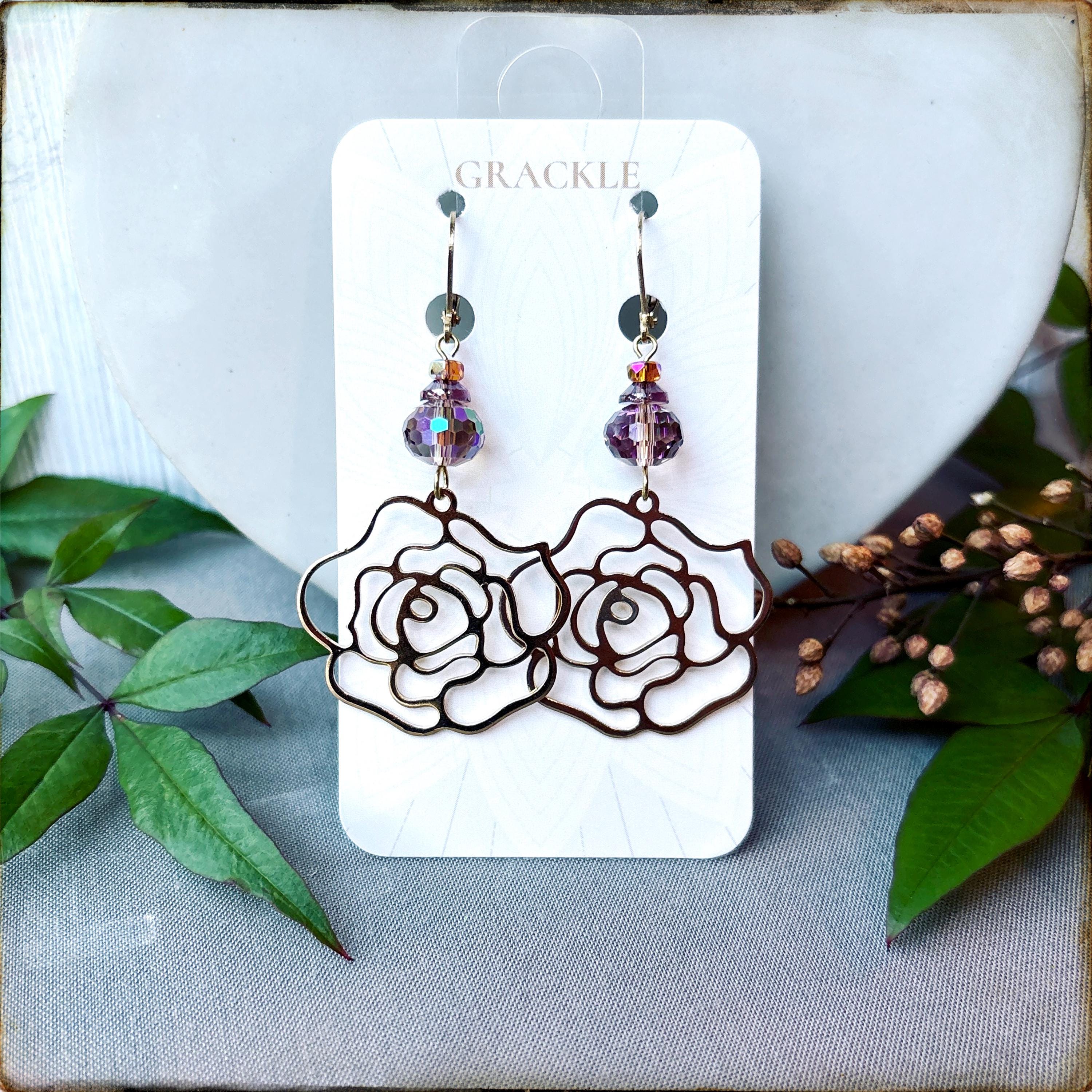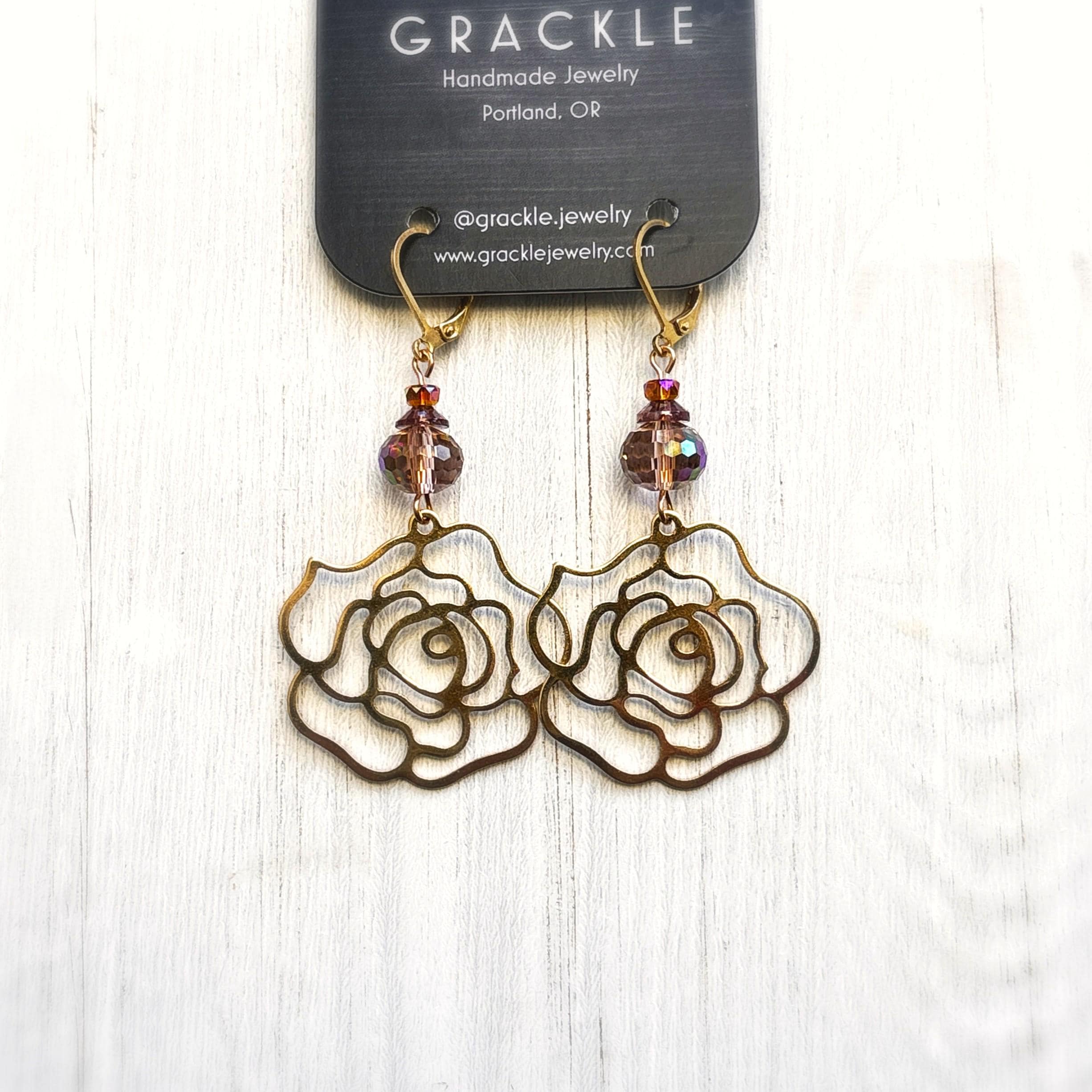 • Brass rose contour charms with iridescent dusty rose, purple, and orange glass beads
