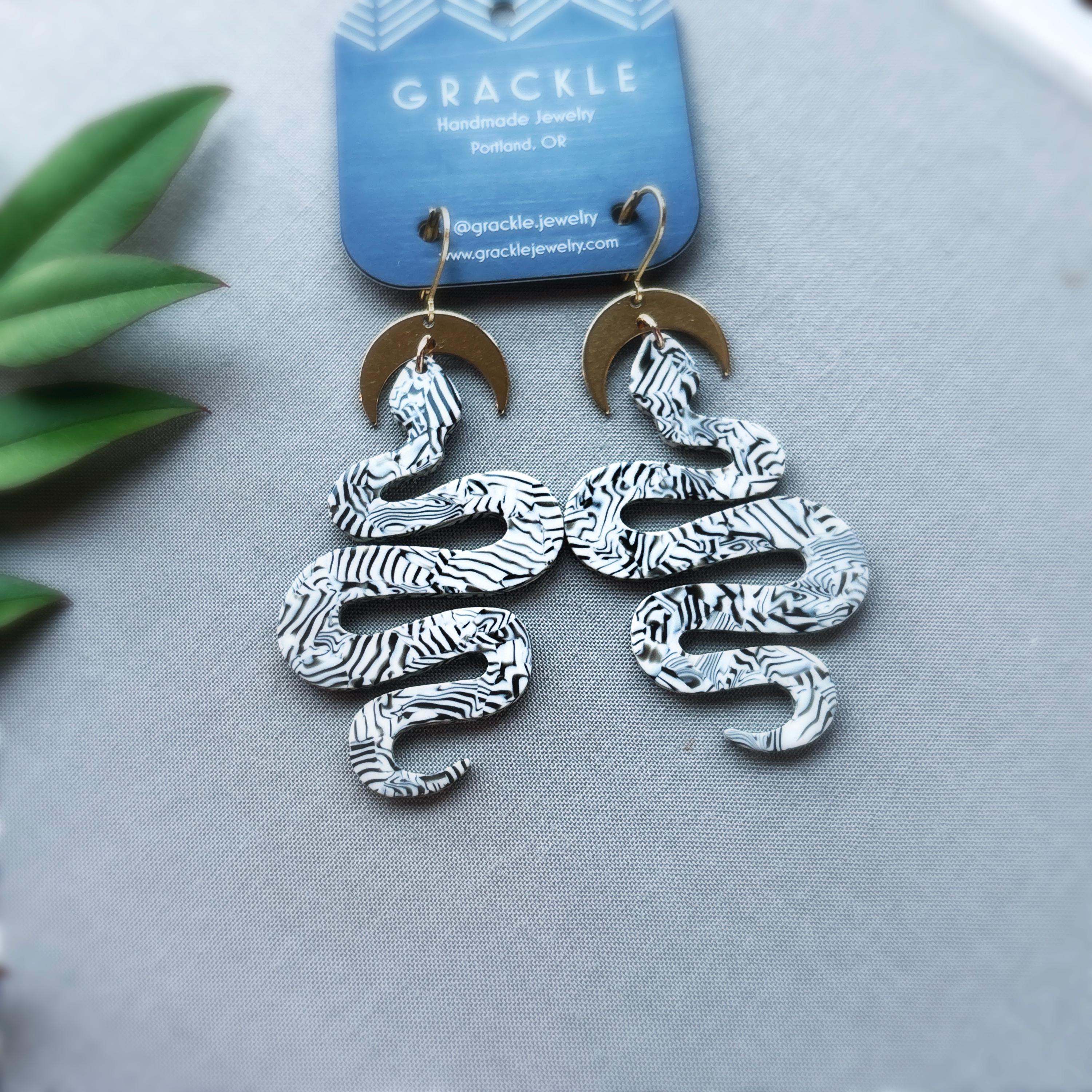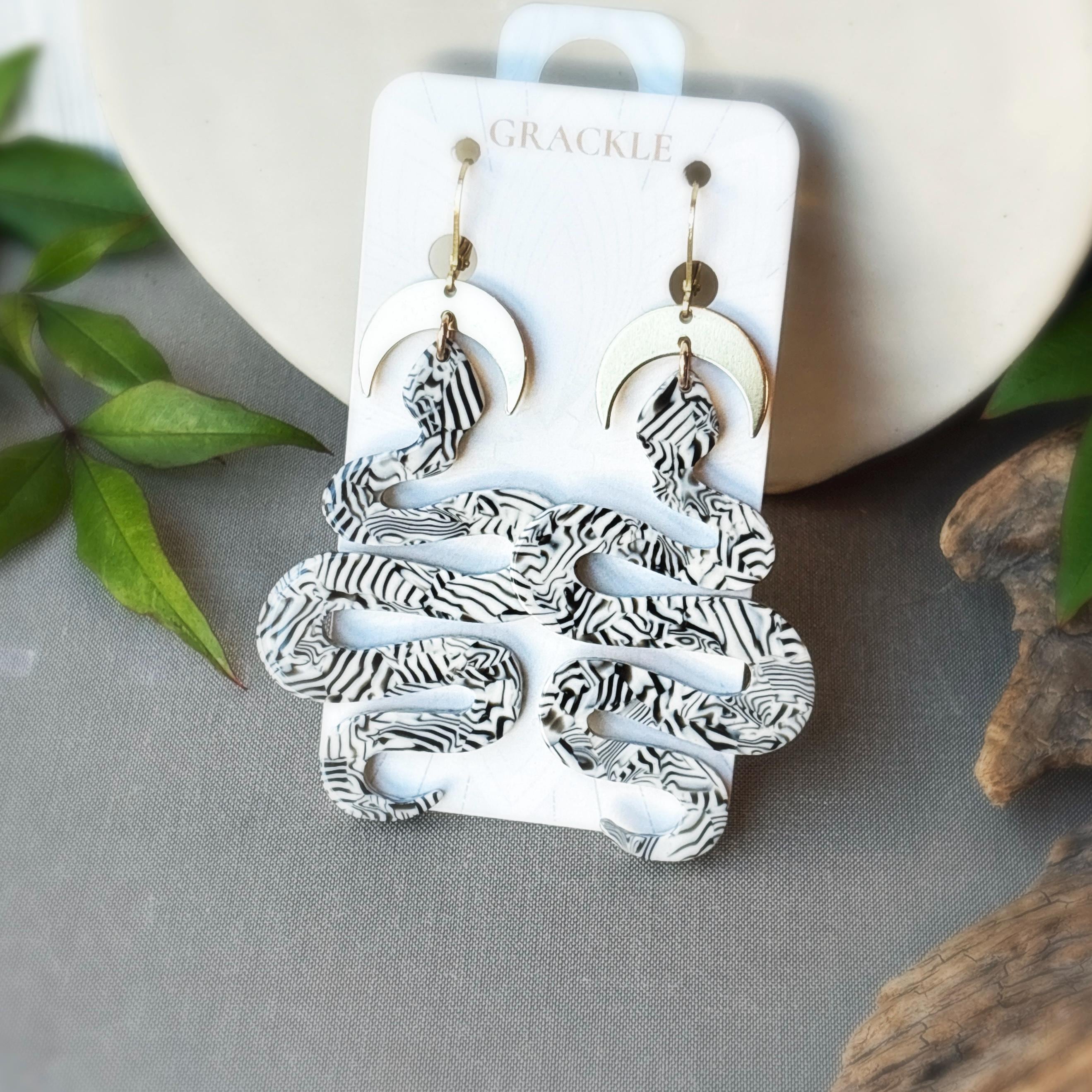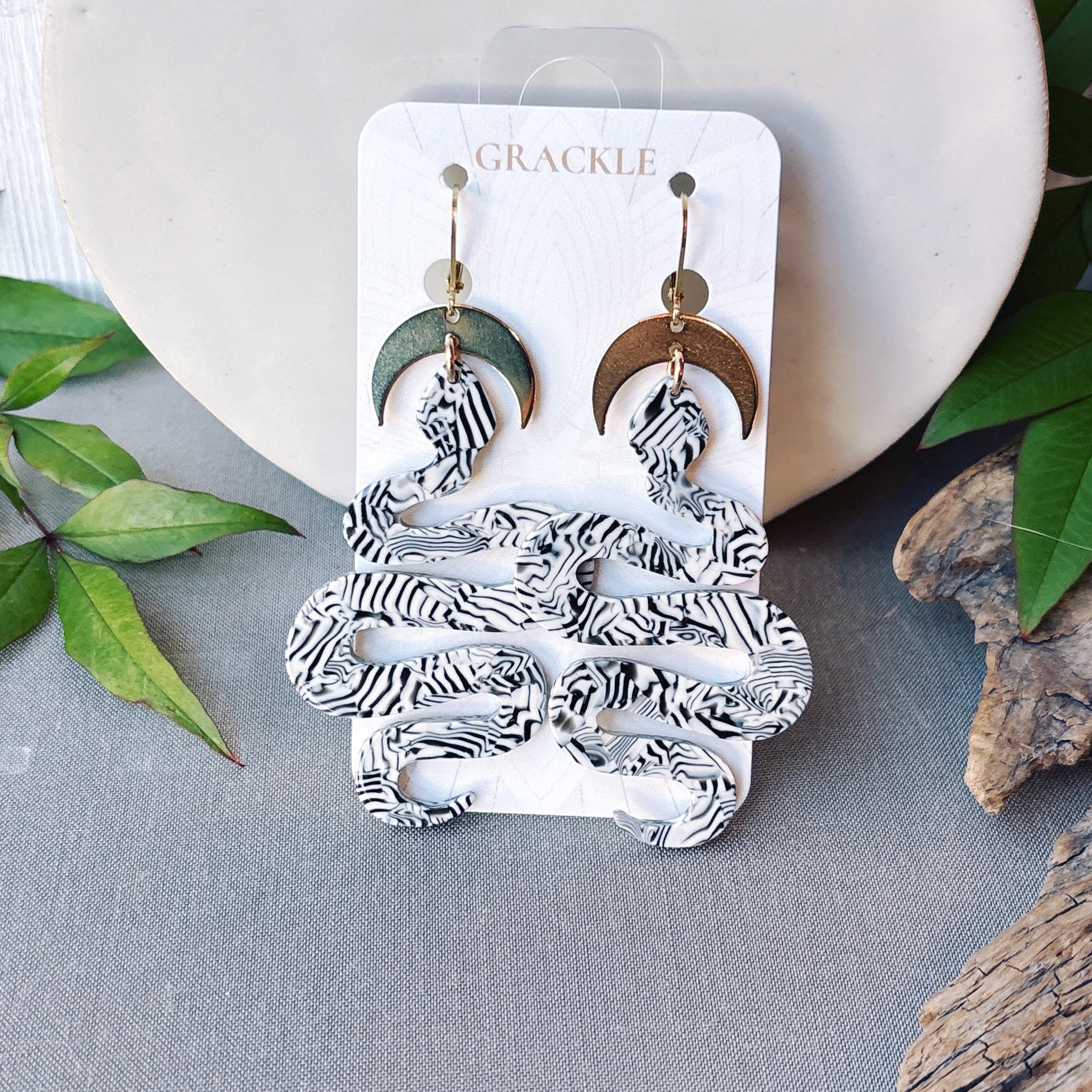 • Brass crescent charms with black and white striped snake charms, made of lightweight non-petroleum cellulose acetate