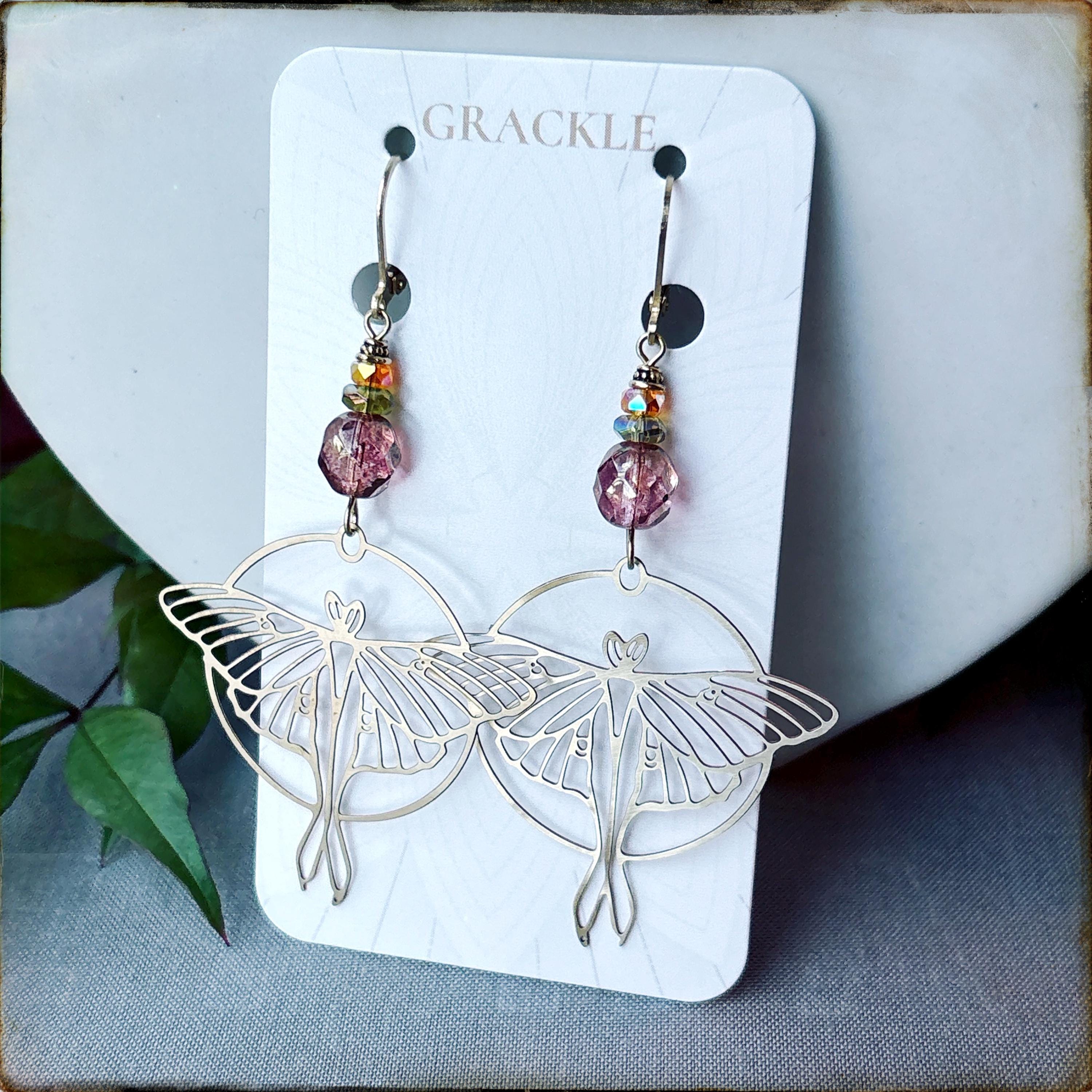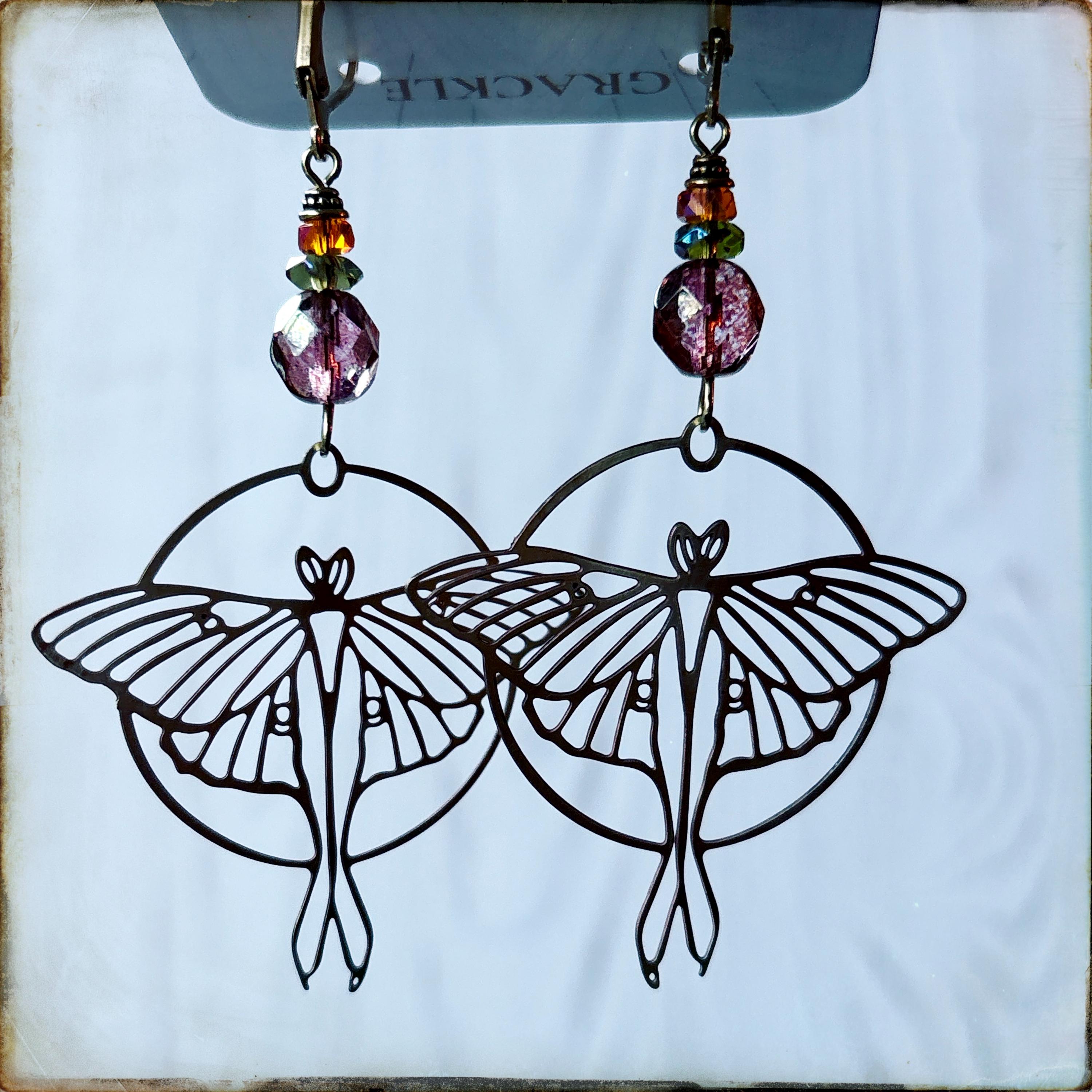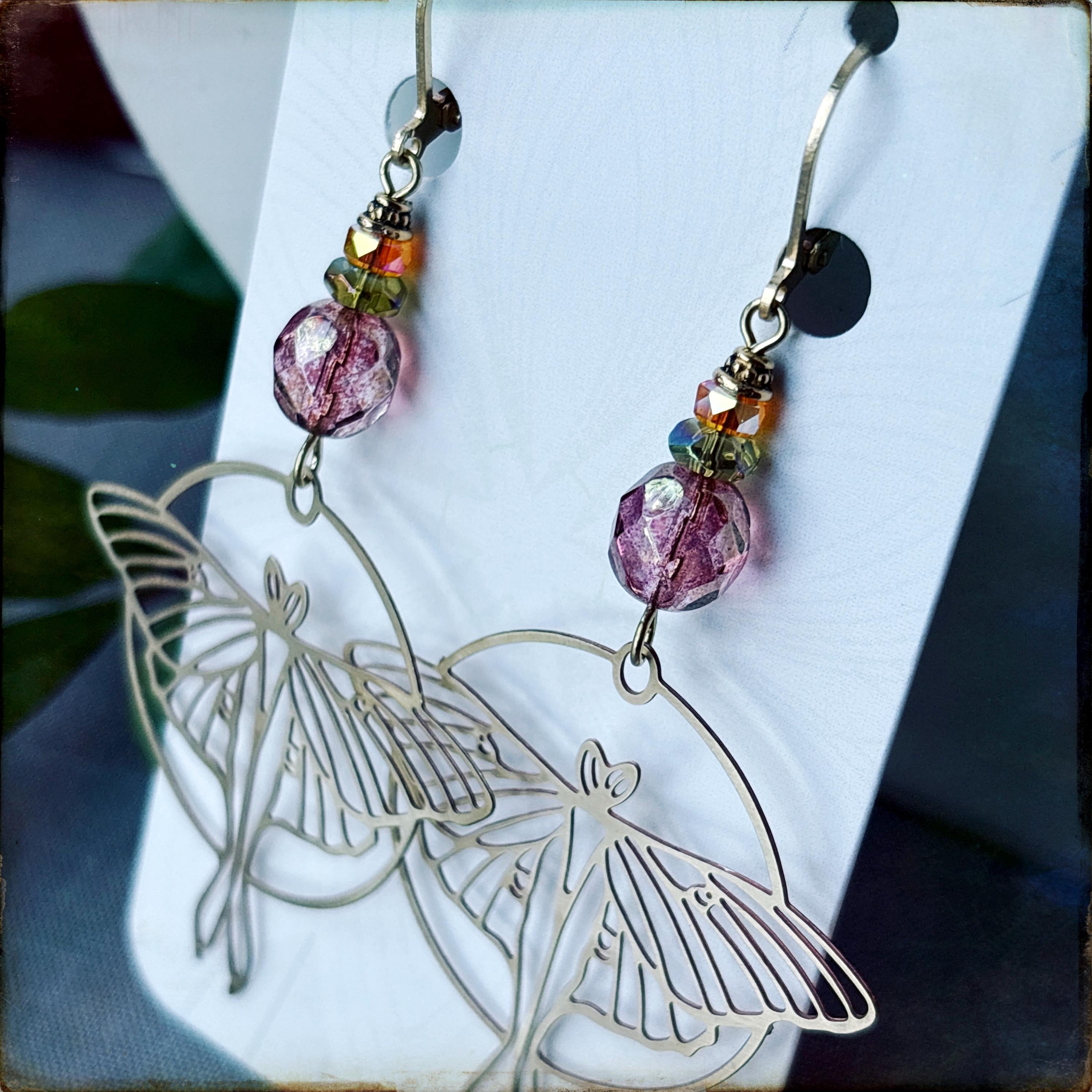 • Delicate brass luna moth charms hang from vintage pink Czech glass beads with orange and olive accents