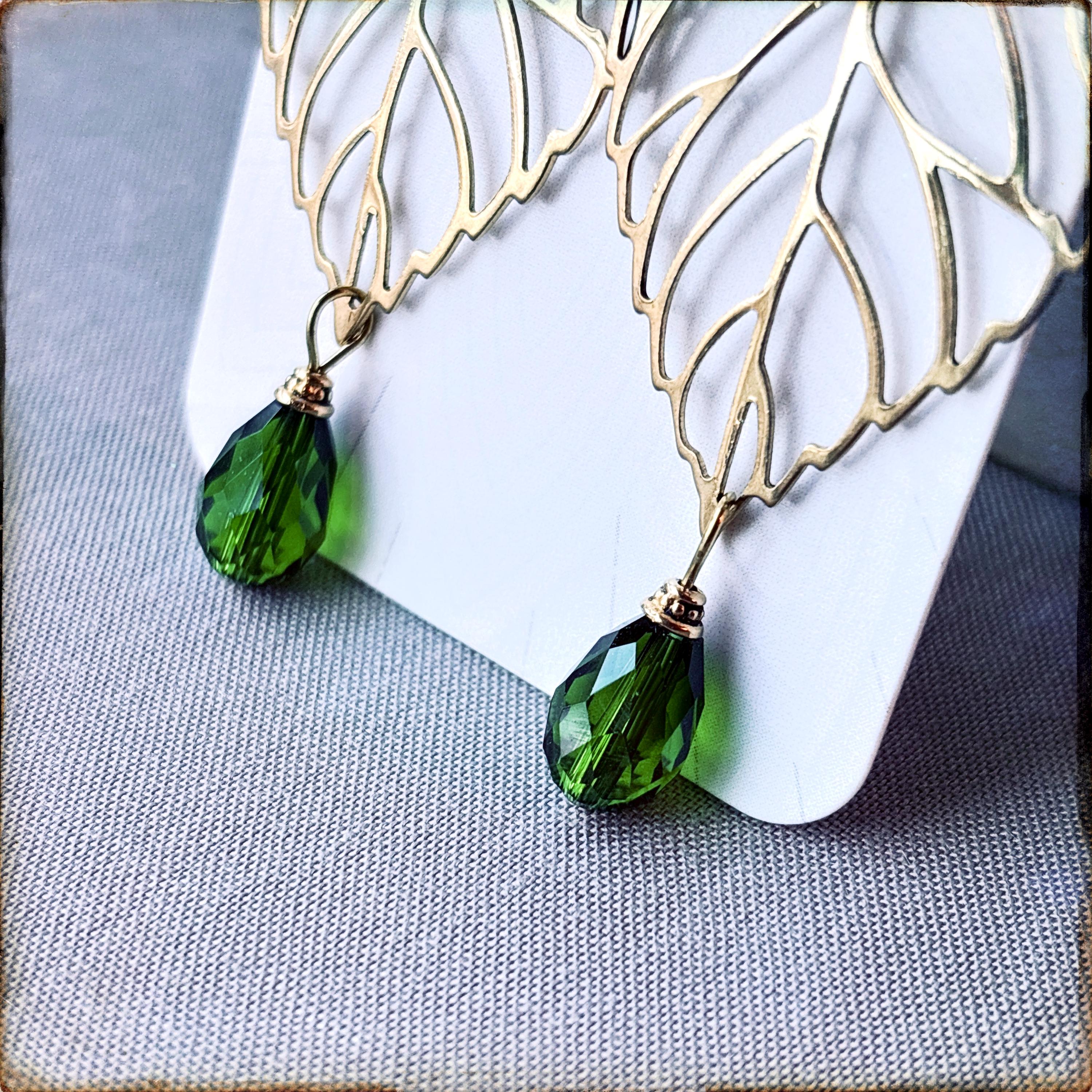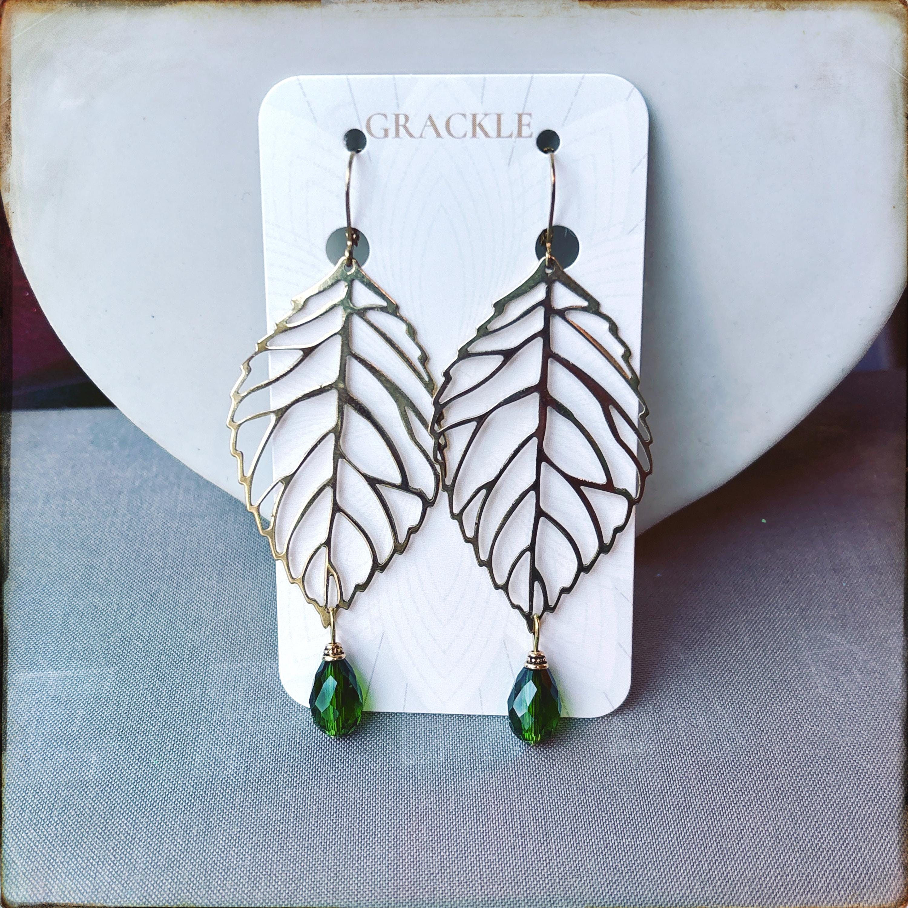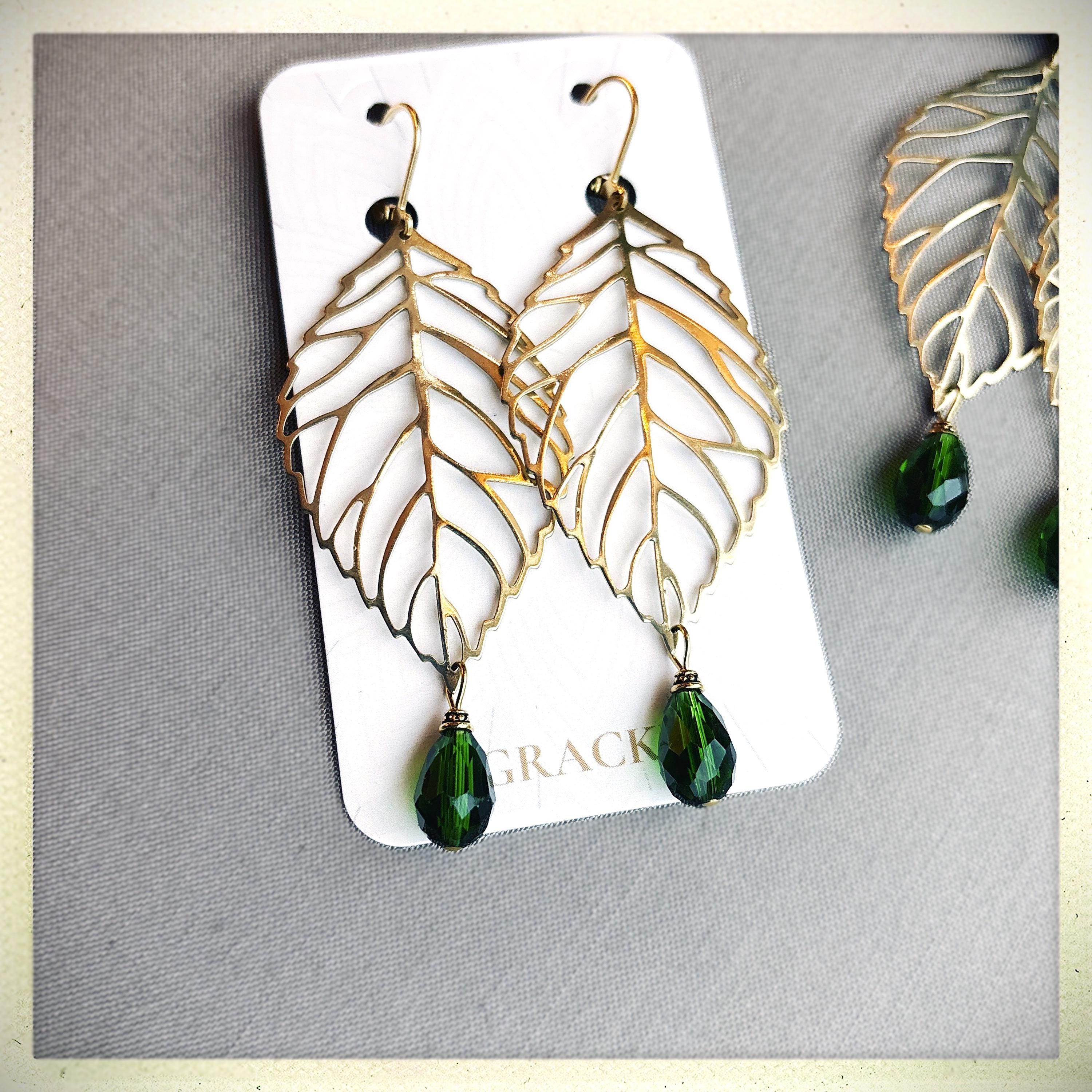 • Large brass leaf cutouts with emerald green glass drops and brass accents