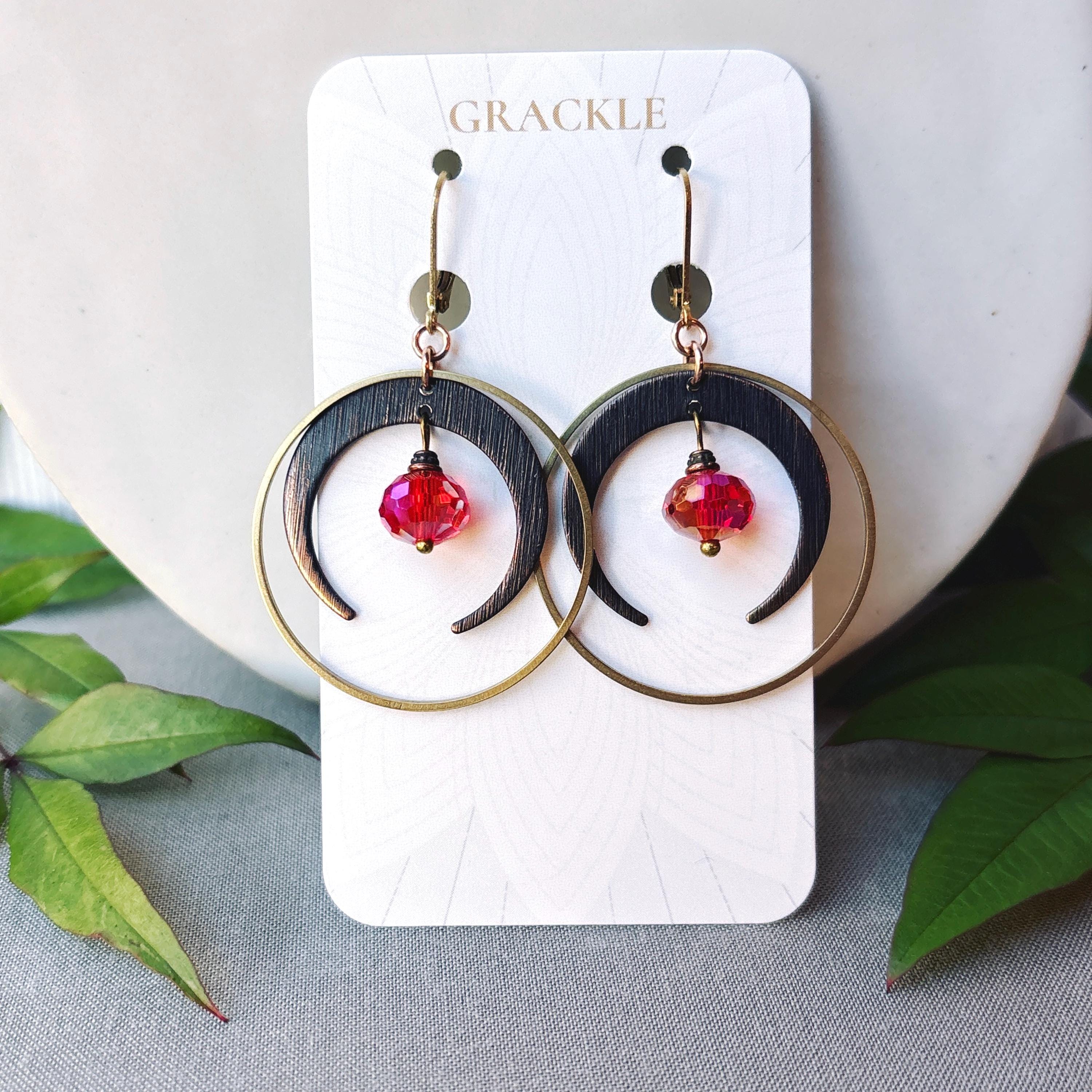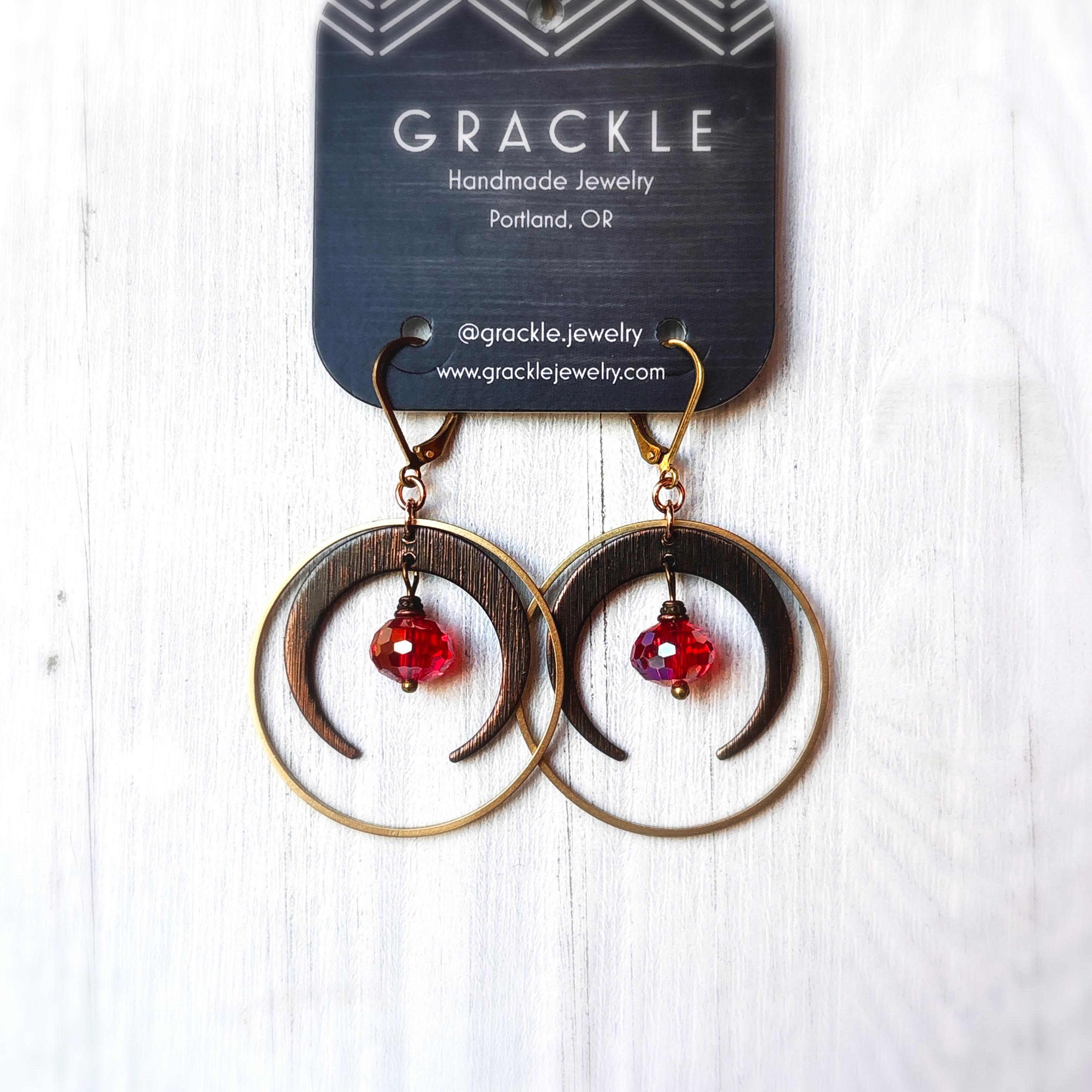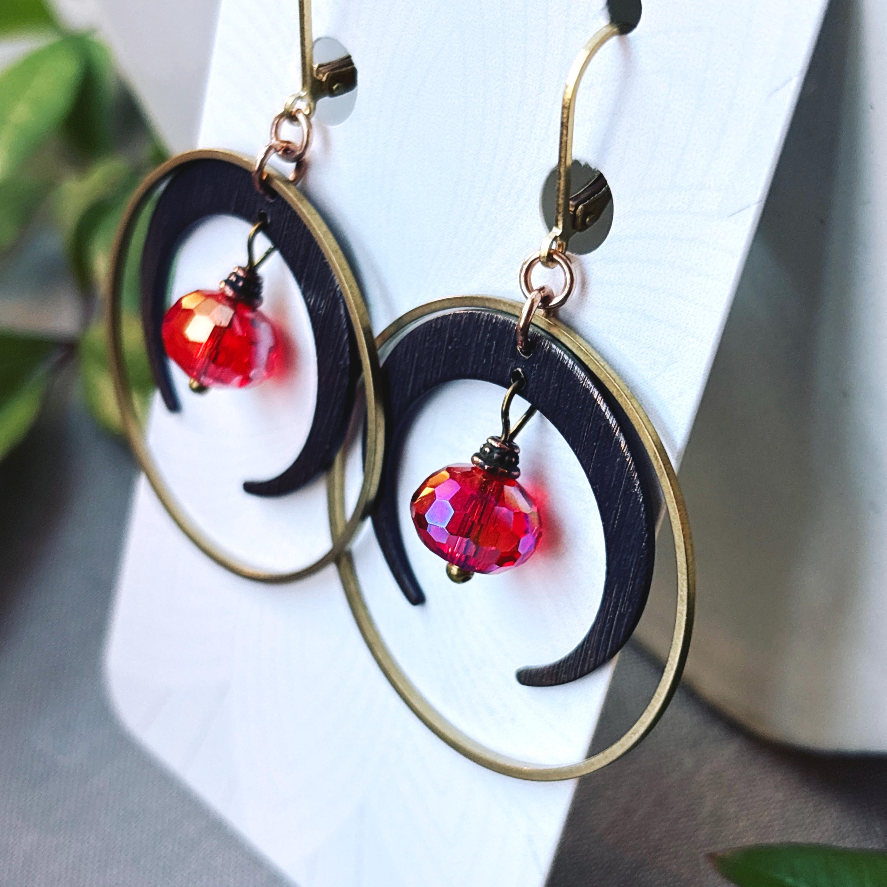 • Oxidized black brass crescents with delicate brass hoops and faceted siam red glass beads