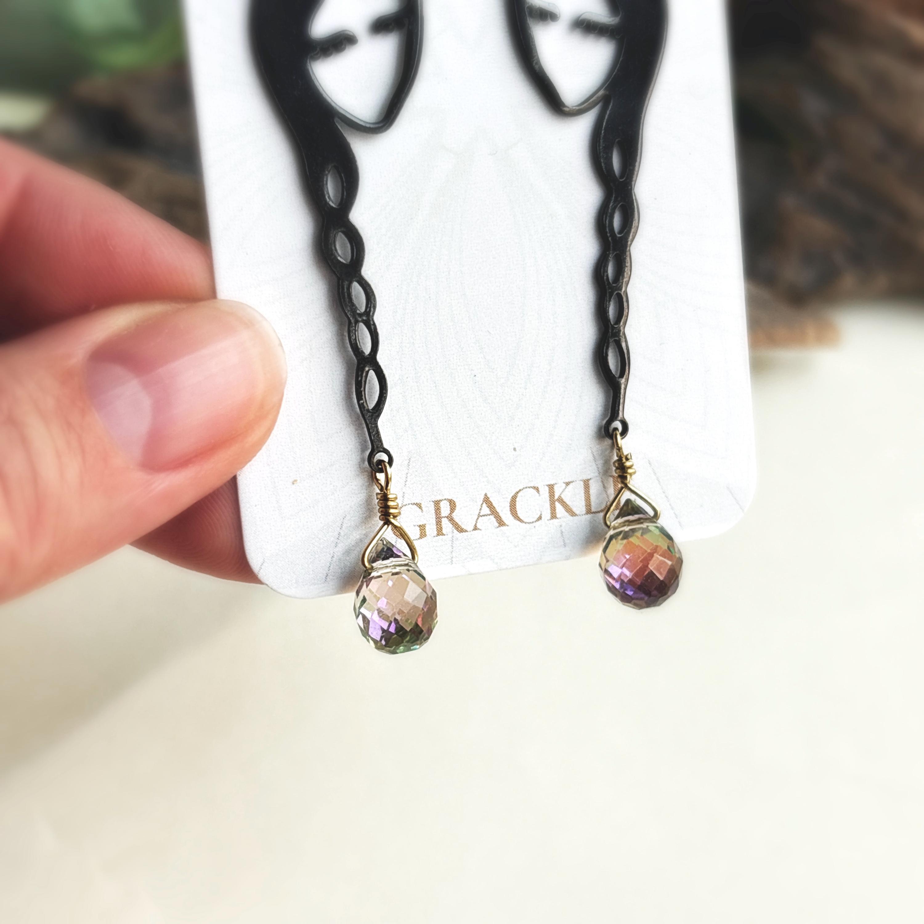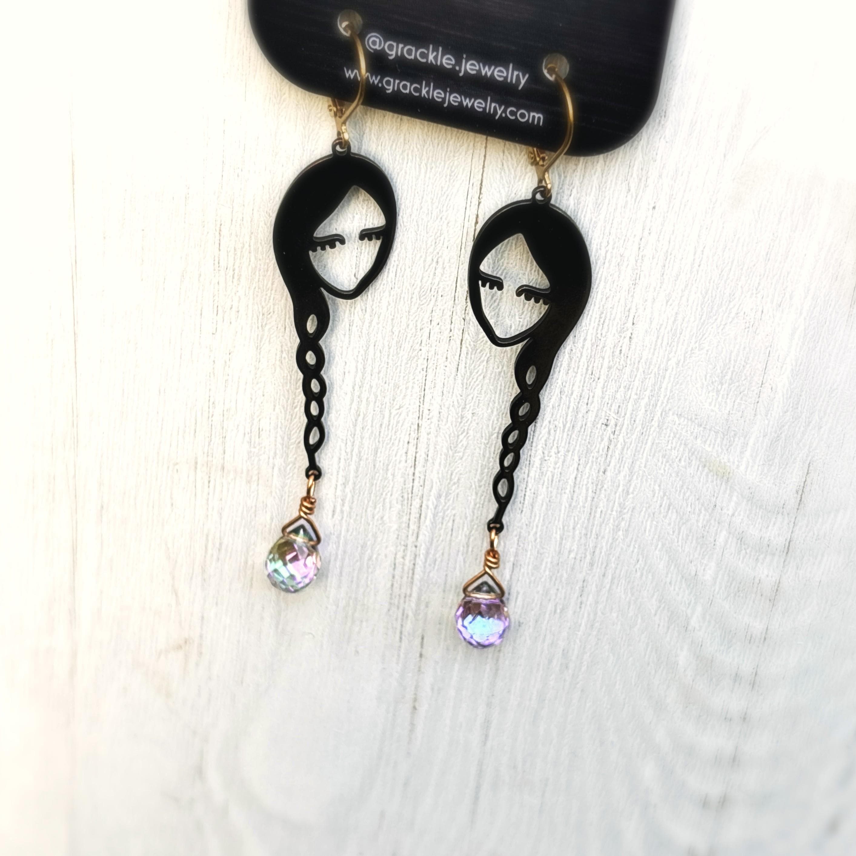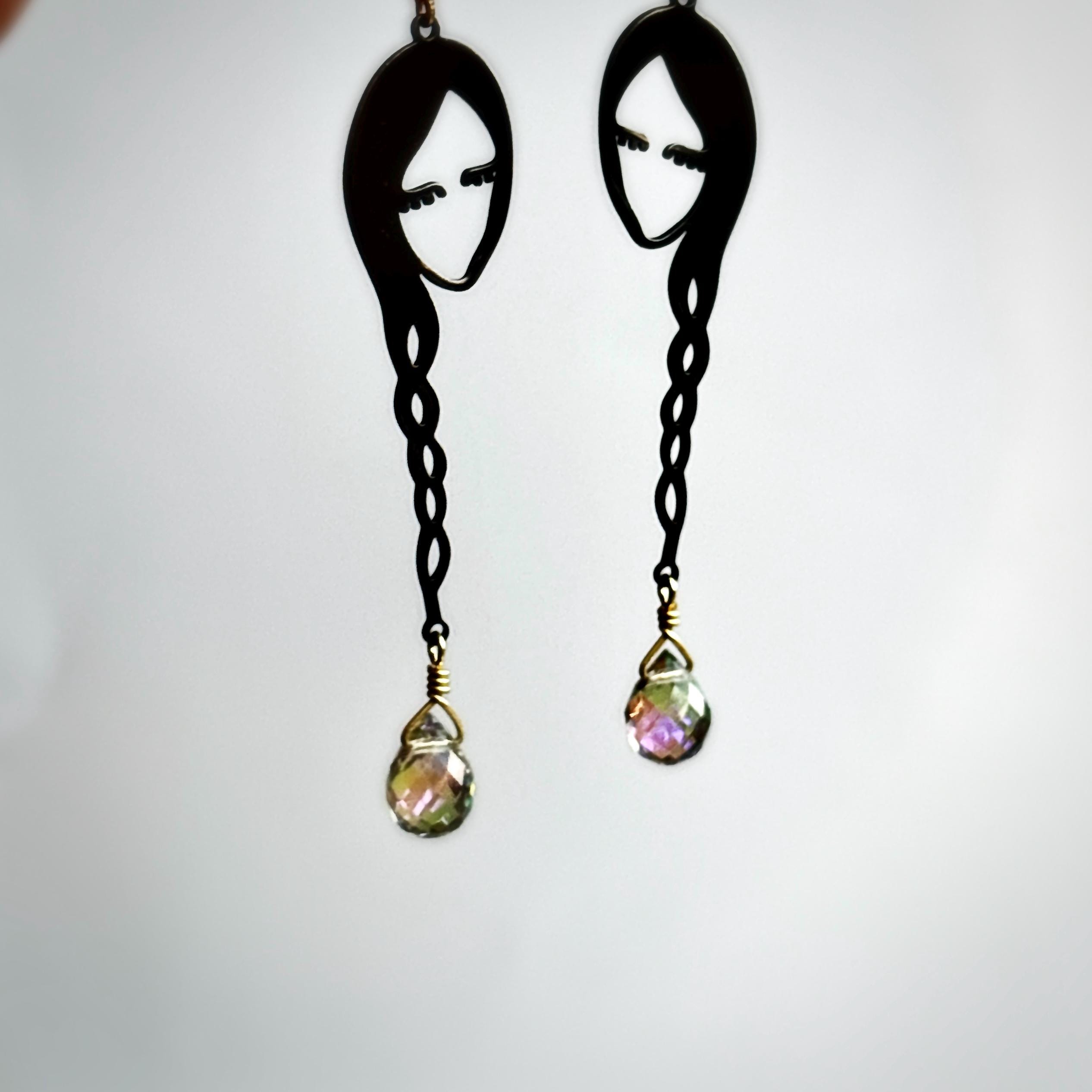 • Oxidized black brass charms showing a female face and braided hair with iridescent faceted glass drops