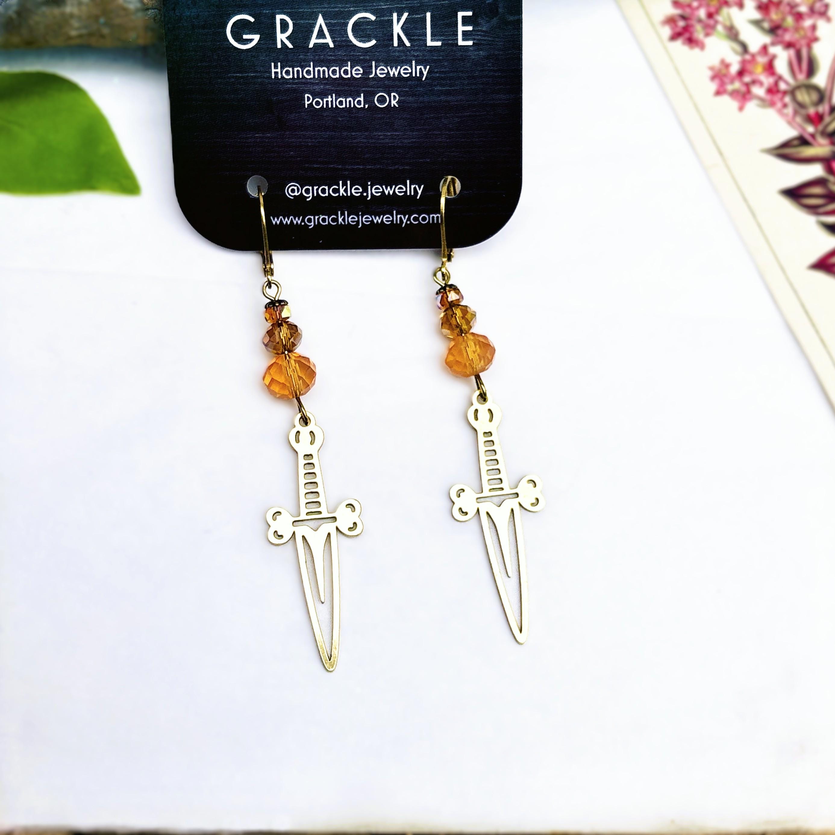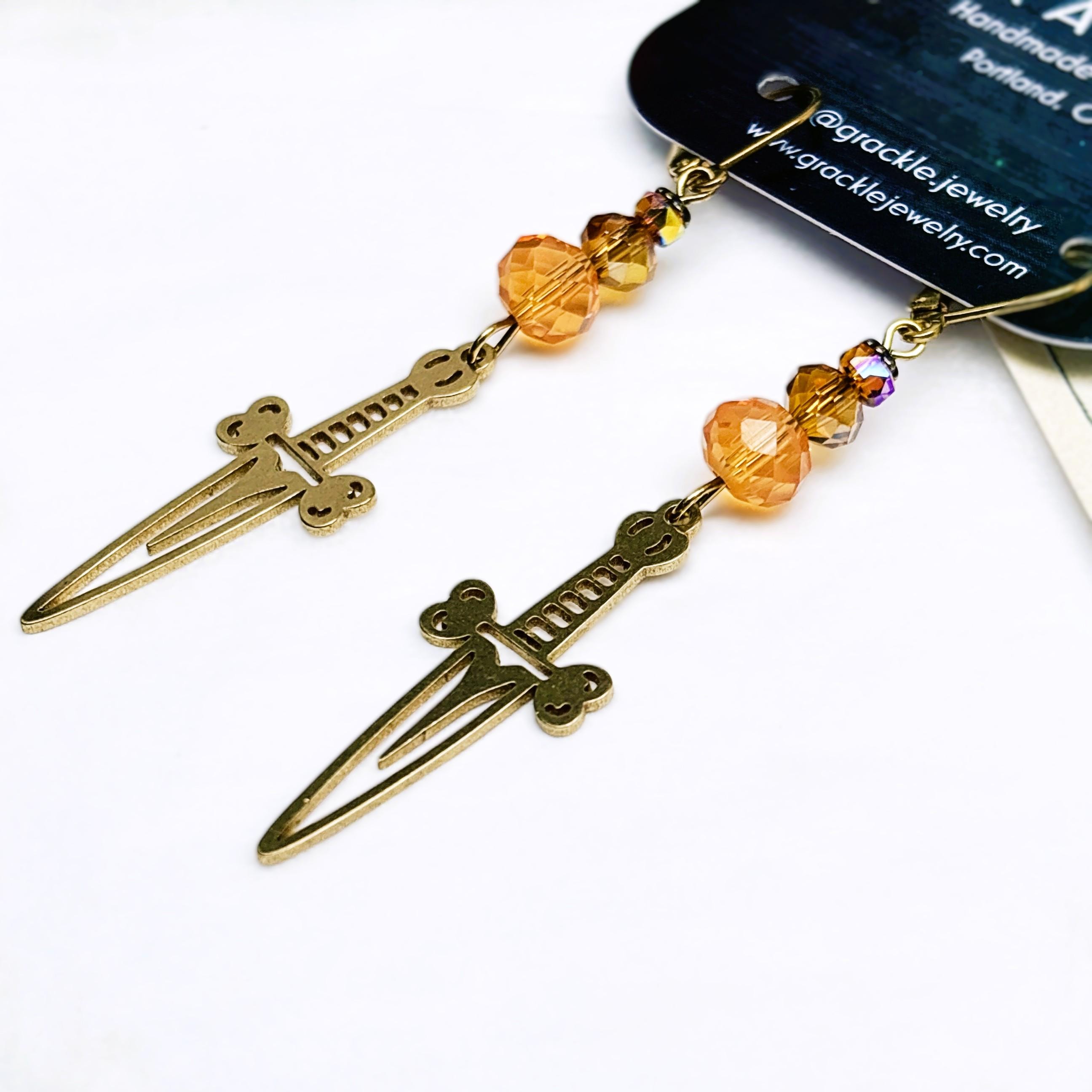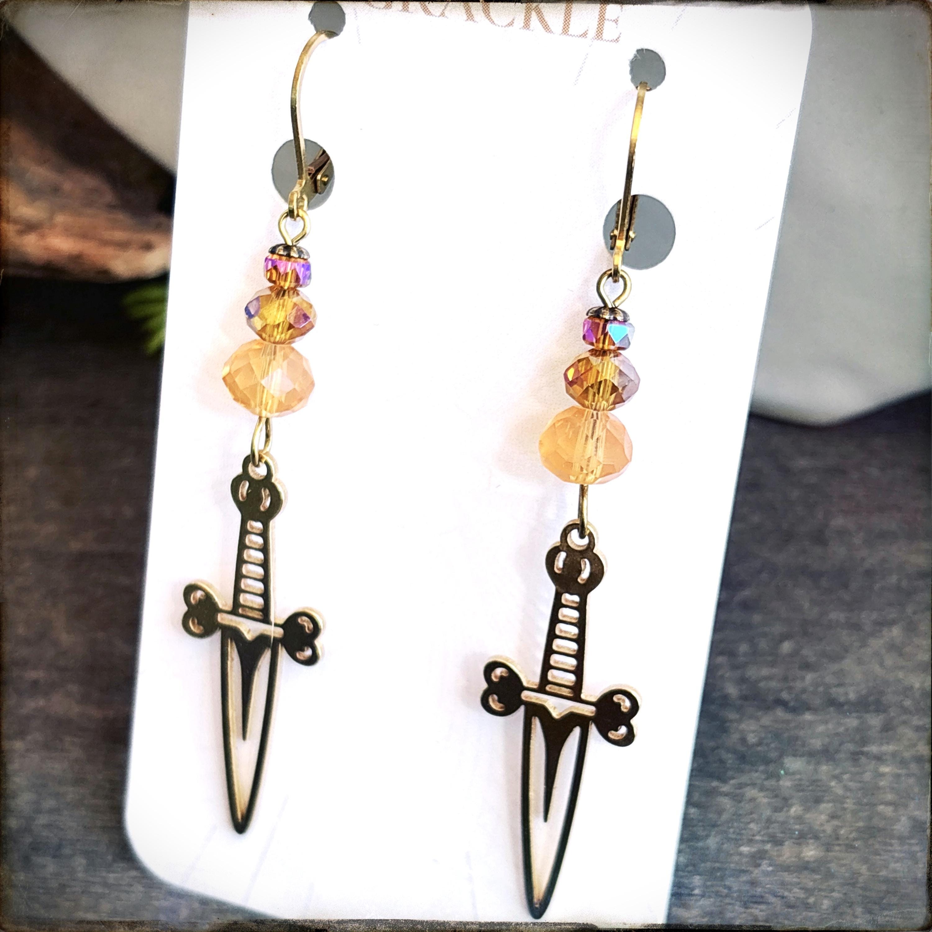 • Brass dagger charms with faceted peach and orange glass beads