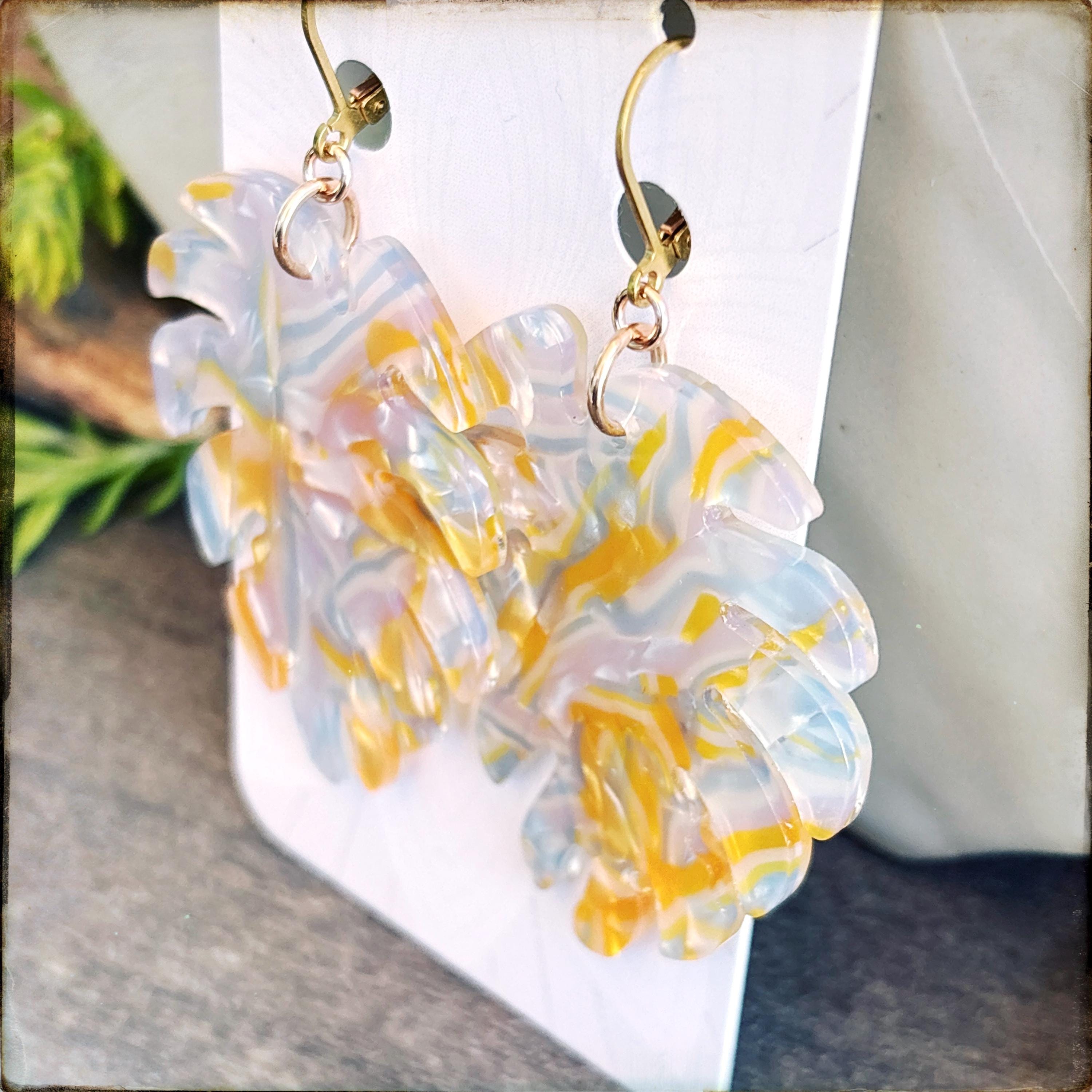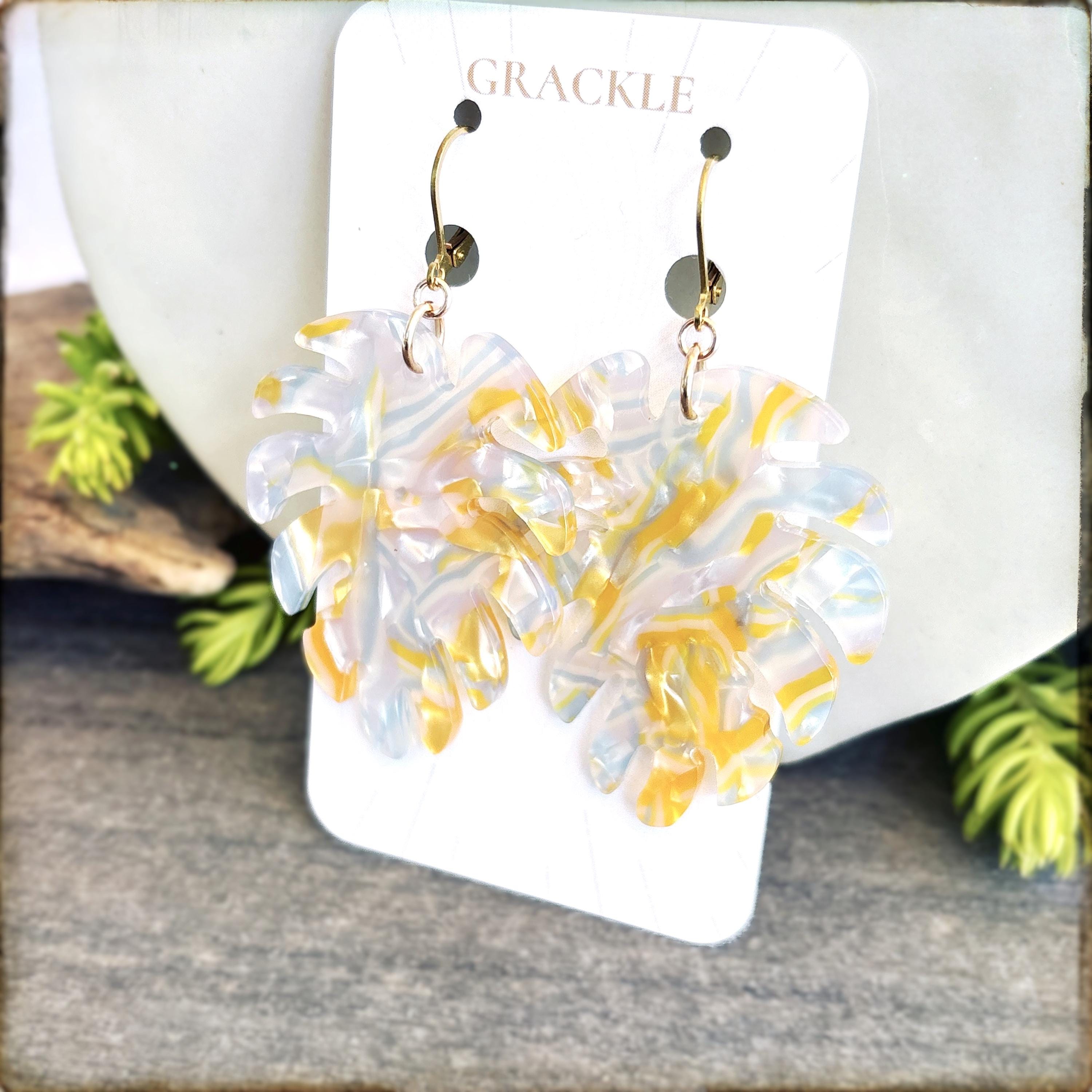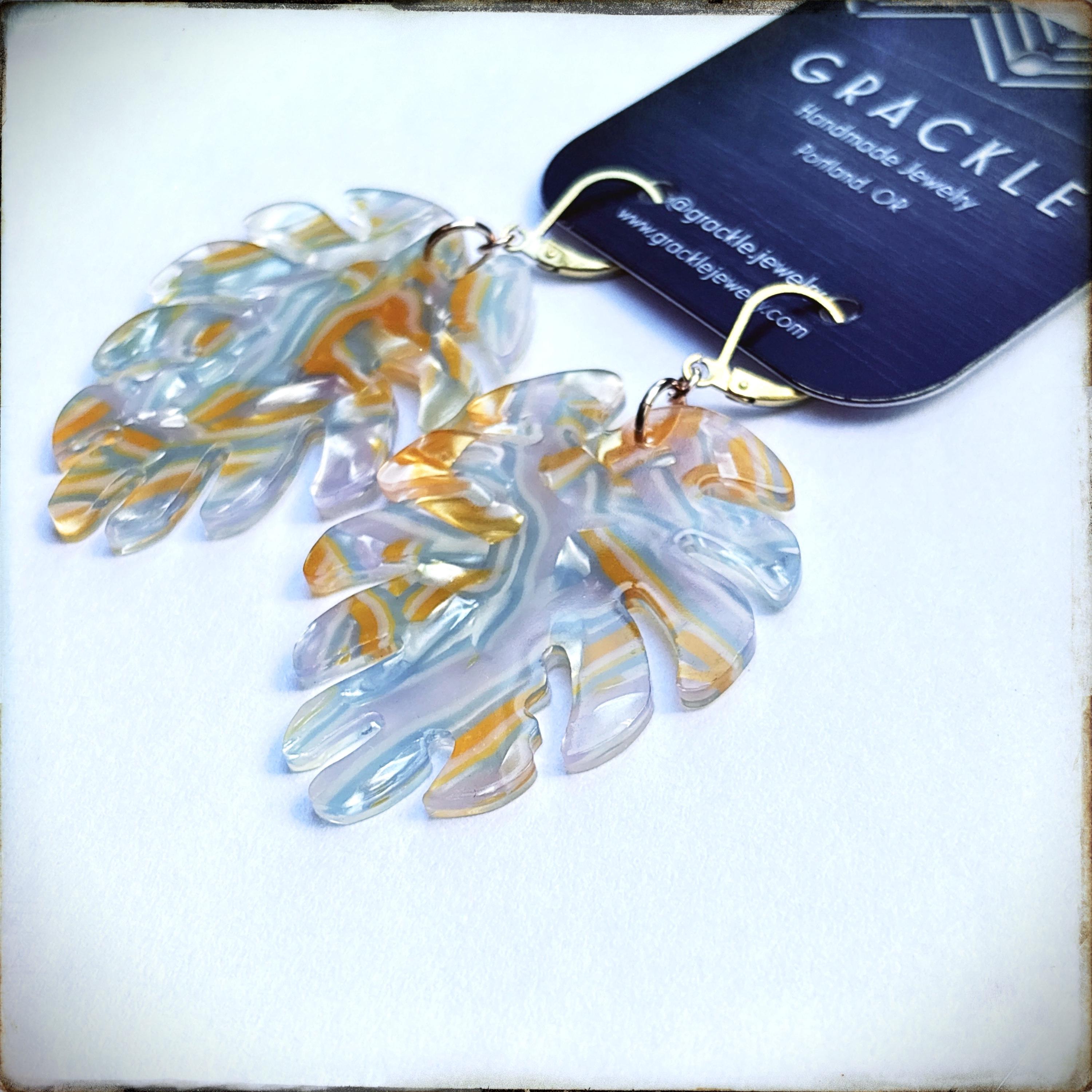 • Lightweight cellulose acetate monstera leaf charms in shimmering pastel blues, yellows, and pinks