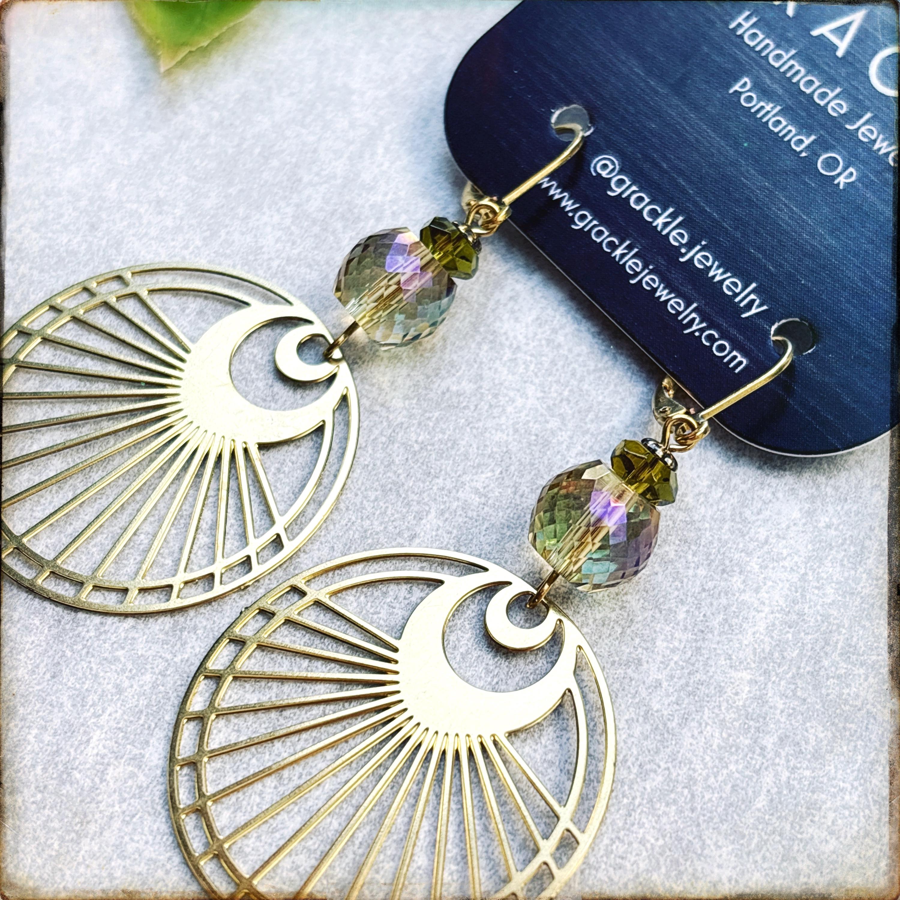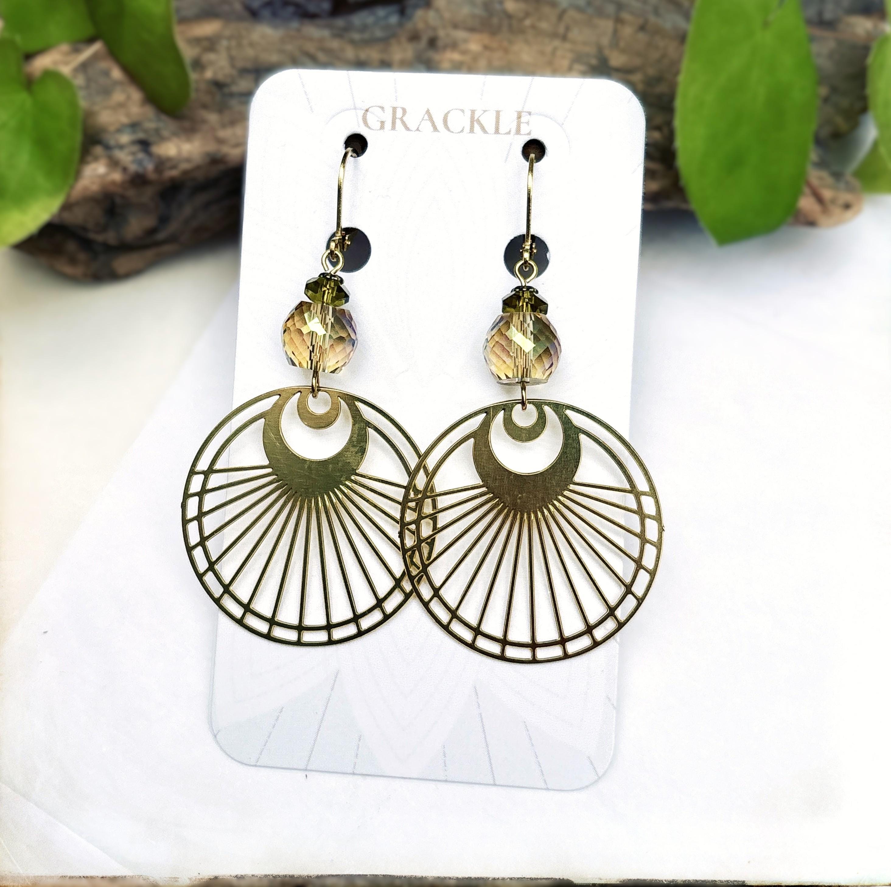 • Geometric brass circle pendants with shimmery faceted olive green glass beads and brass accents