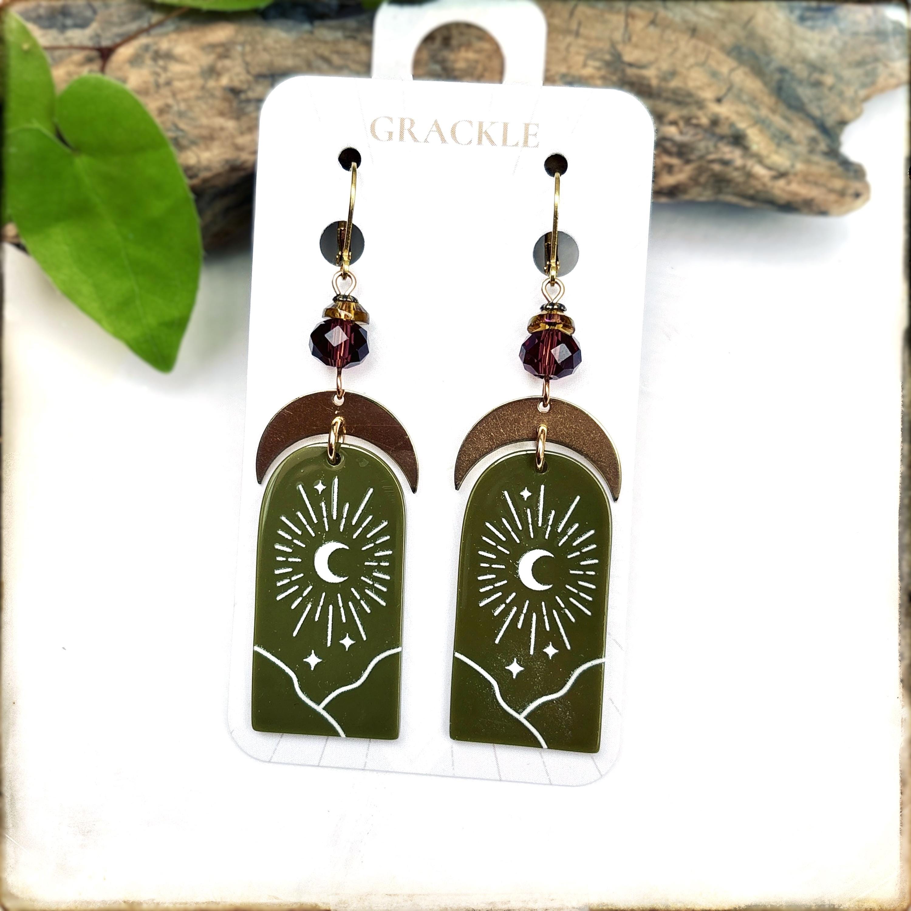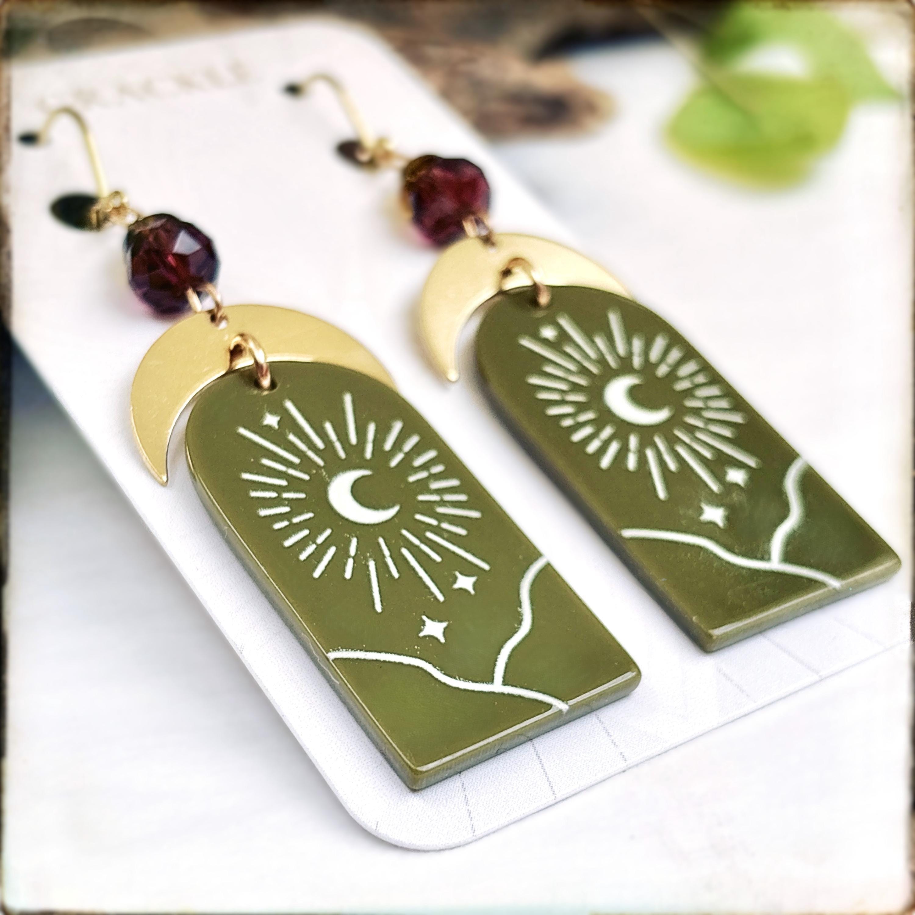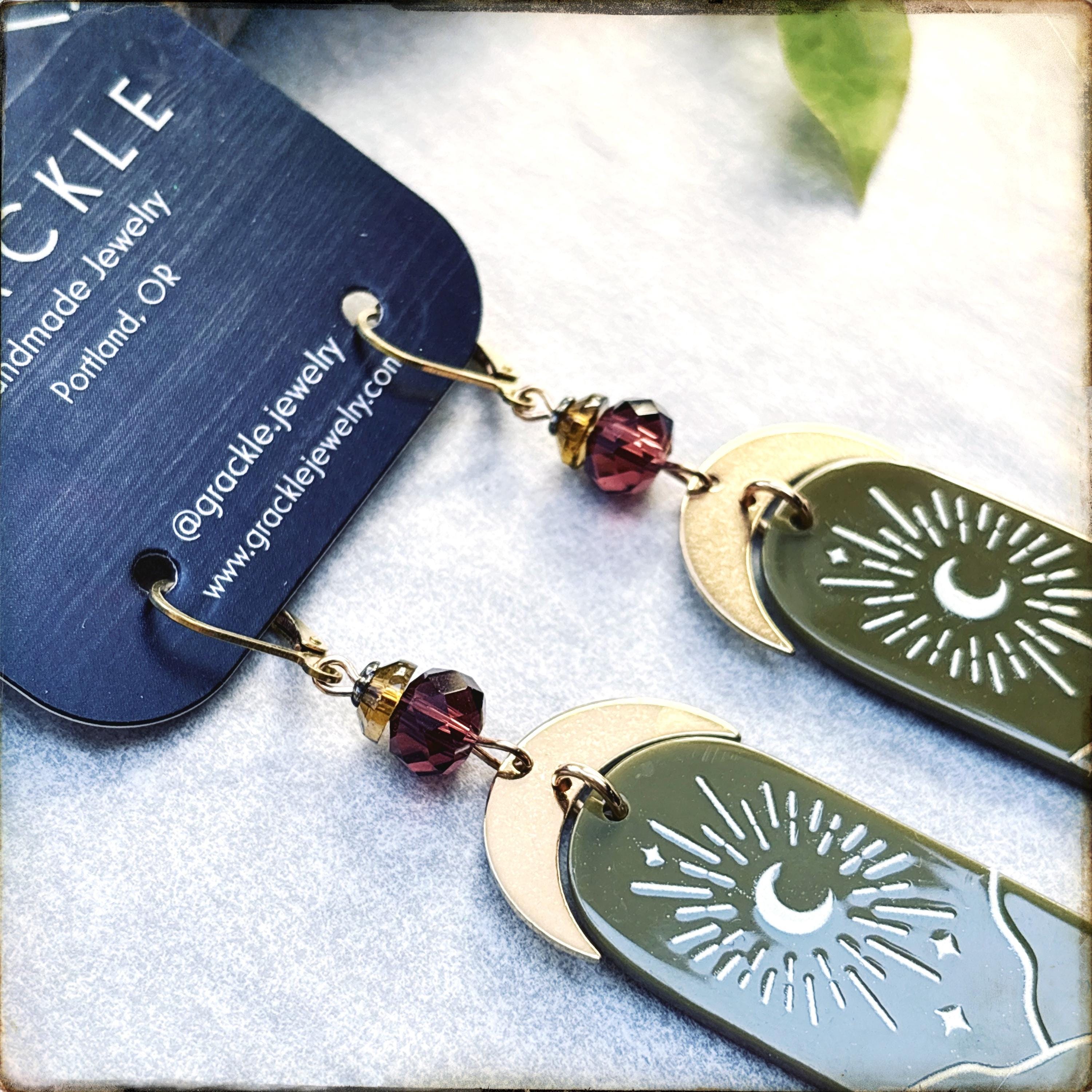 • Lightweight embossed acrylic charms with brass crescents and deep purple glass beads